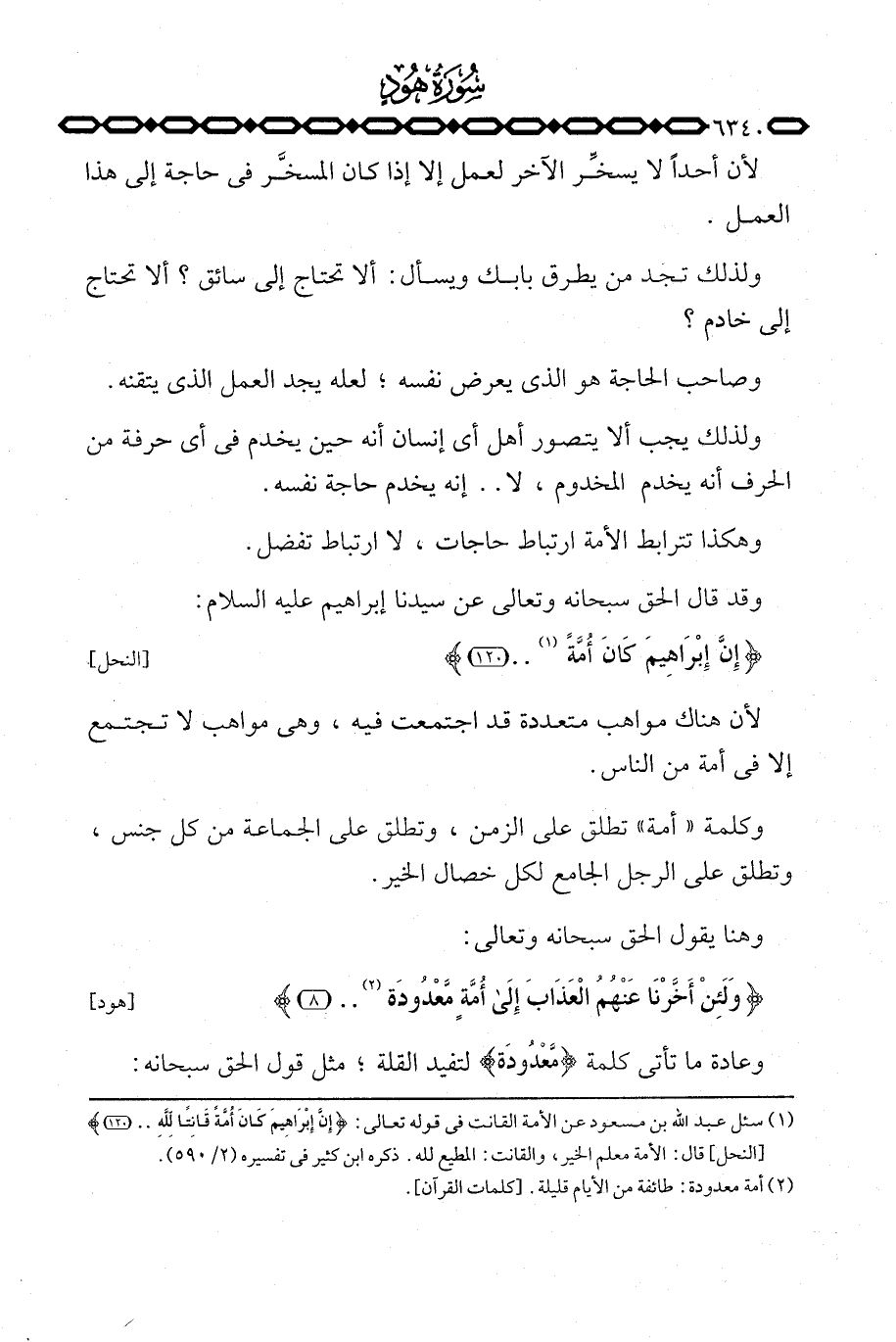 وكلمة «أمة» تطلق على الزمن، وتطلق على الجماعة من كل جنس، وتطلق على الرجل الجامع لكل خصال الخير.