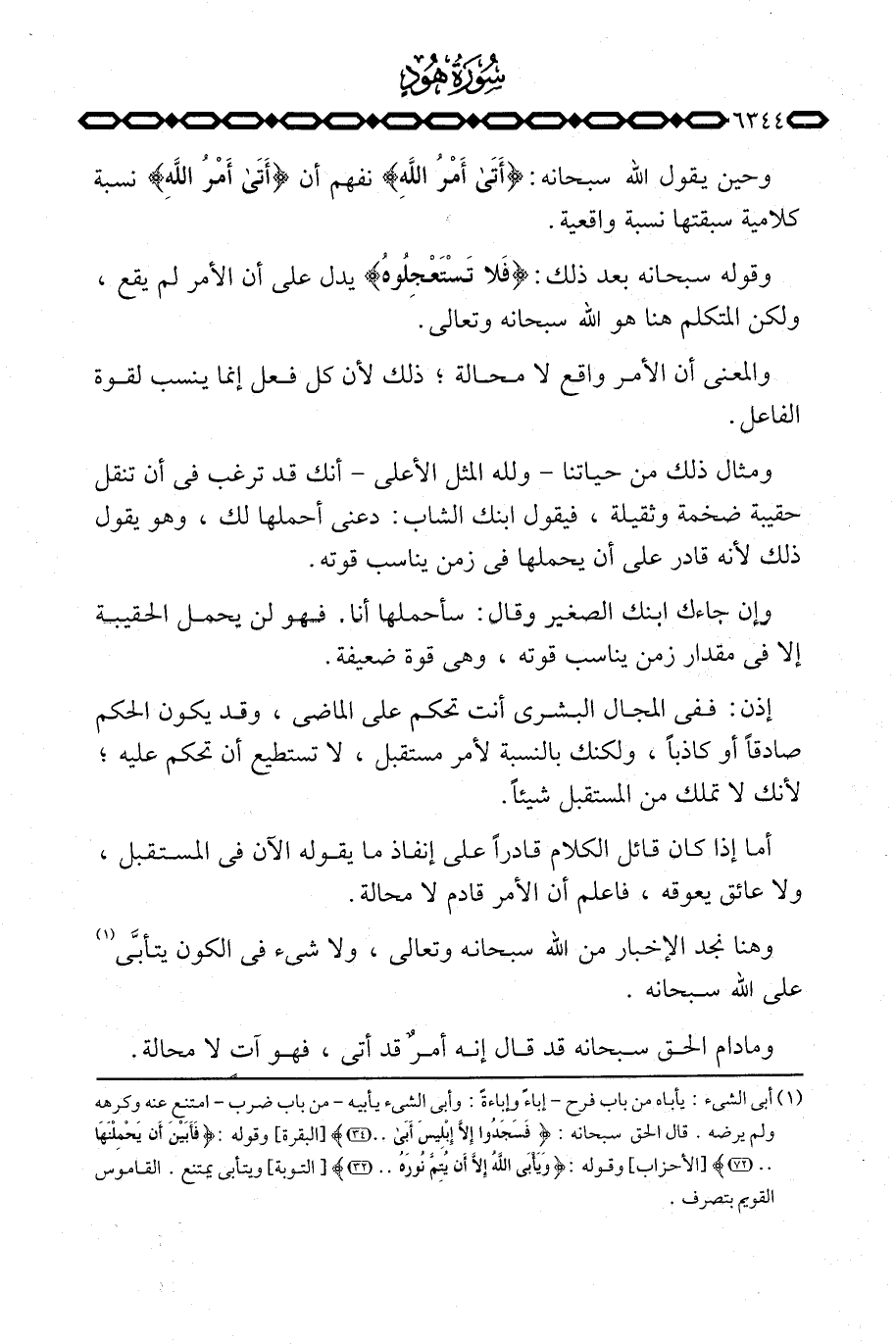 ومثال ذلك من حياتنا ولله المثل الأعلى أنك قد ترغب في أن تنقل حقيبة ضخمة وثقيلة، فيقول ابنك الشاب: دعني أحملها لك، وهو يقول ذلك لأنه قادر على أن يحملها في زمن يناسب قوته.