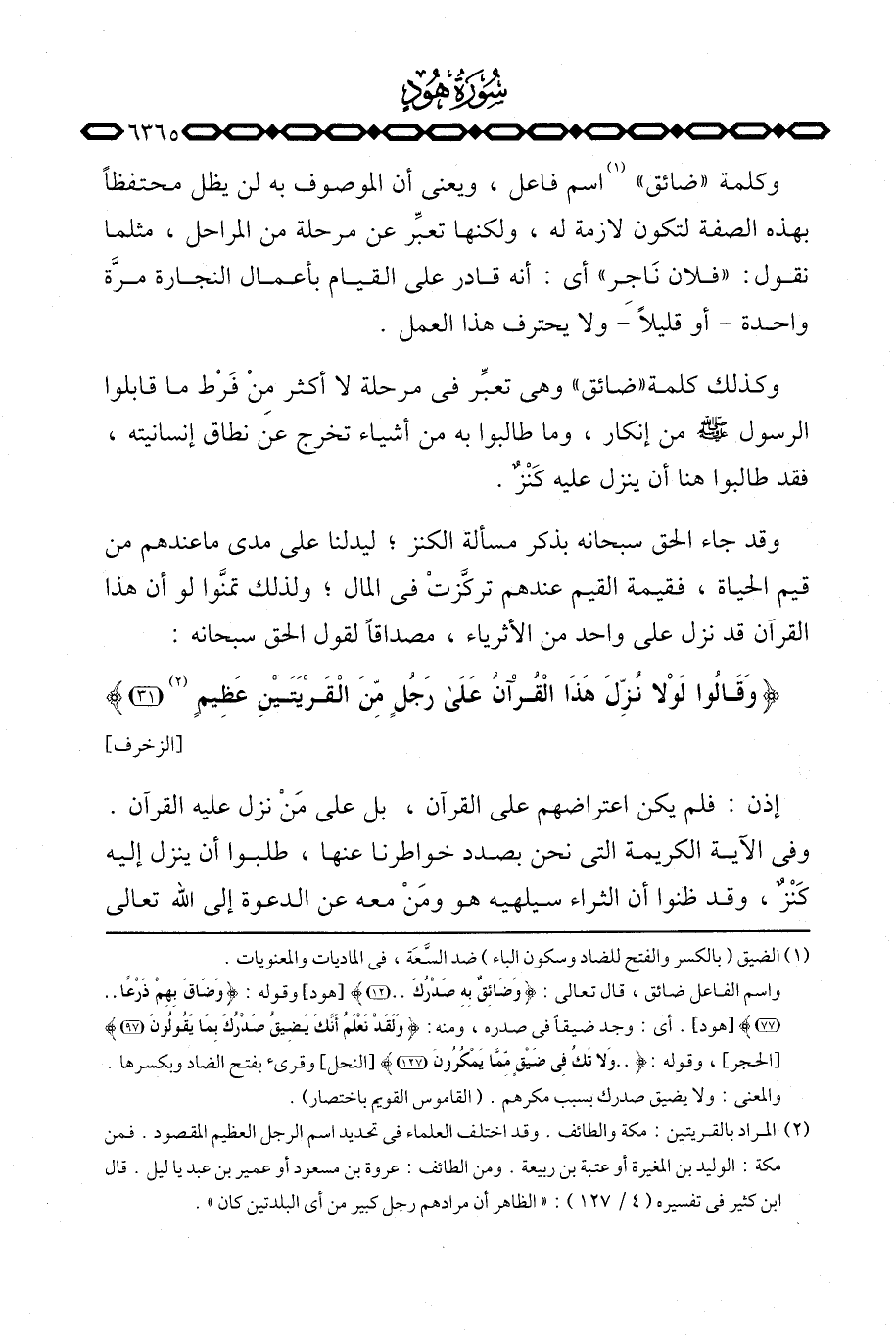 وكذلك كلمة «ضائق» وهي تعبِّر في مرحلة لا أكثر مِنْ فَرْط ما قابلوا الرسول صَلَّى اللَّهُ عَلَيْهِ وَسَلَّم َ من إنكار، وما طالبوا به من أشياء تخرج عن نطاق إنسانيته، فقد طالبوا هنا أن ينزل عليه كَنْزٌ.