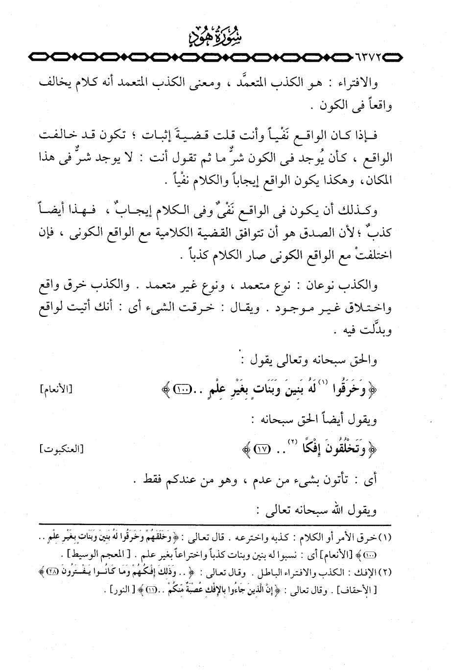 فإذا كان الواقع نَفْياً وأنت قلت قضيةَ إثبات؛ تكون قد خالفت الواقع، كأن يُوجد في الكون شرٌّ ما ثم تقول أنت: لا يوجد شرٌّ في هذا المكان، وهكذا يكون الواقع إيجاباً والكلام نفْياً.