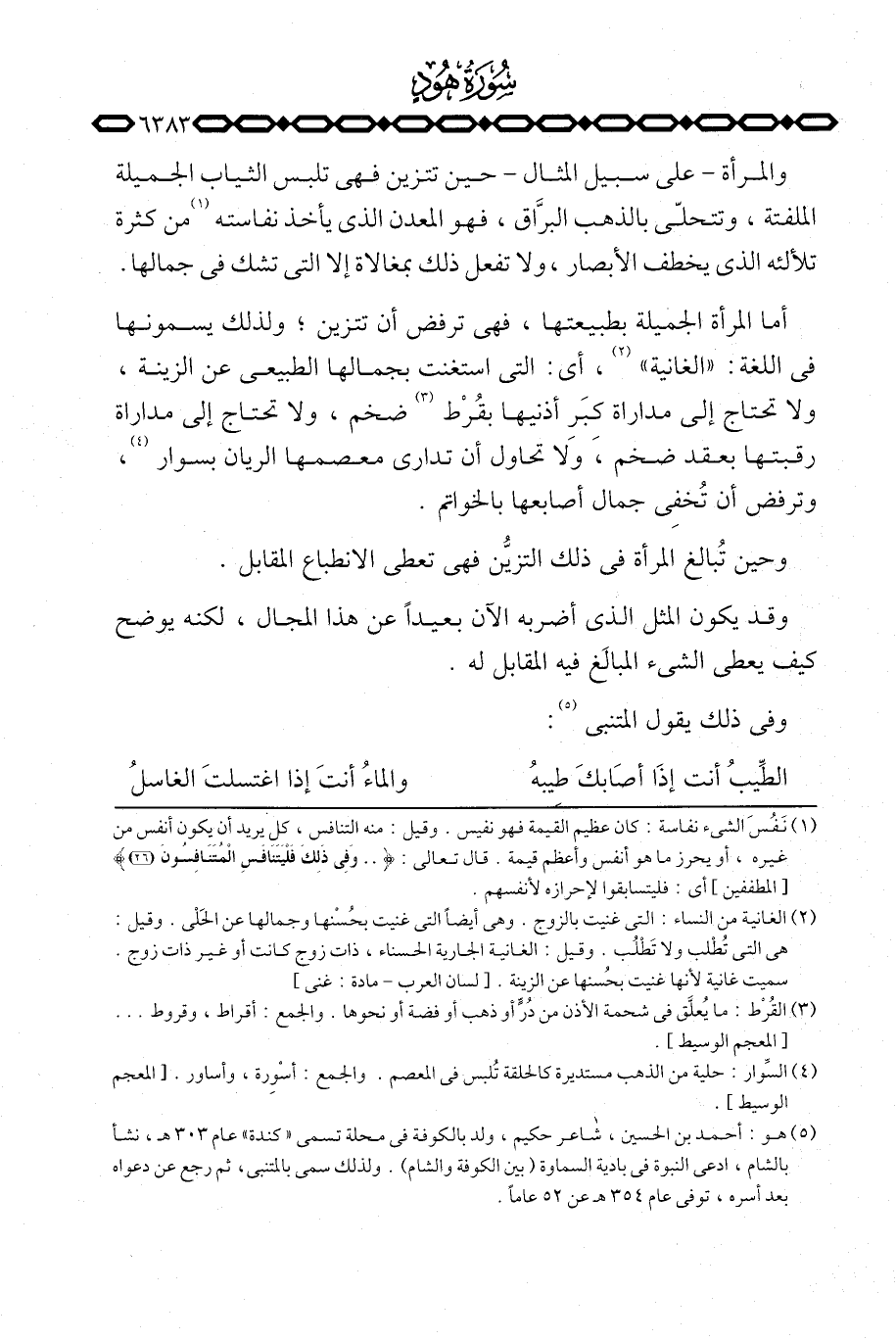 أما المرأة الجميلة بطبيعتها، فهي ترفض أن تتزين؛ ولذلك يسمونها في اللغة: «الغانية» ، أي: التي استغنت بجمالها الطبيعي عن الزينة، ولا تحتاج إلى مداراة كِبرَ أذنيها بقُرْط ضخم، ولا تحتاج إلى مداراة رقبتها بعقد ضخم، ولا تحاول أن تداري معصمها الريان بسوار، وترفض أن تُخفِي جمال أصابعها بالخواتم.