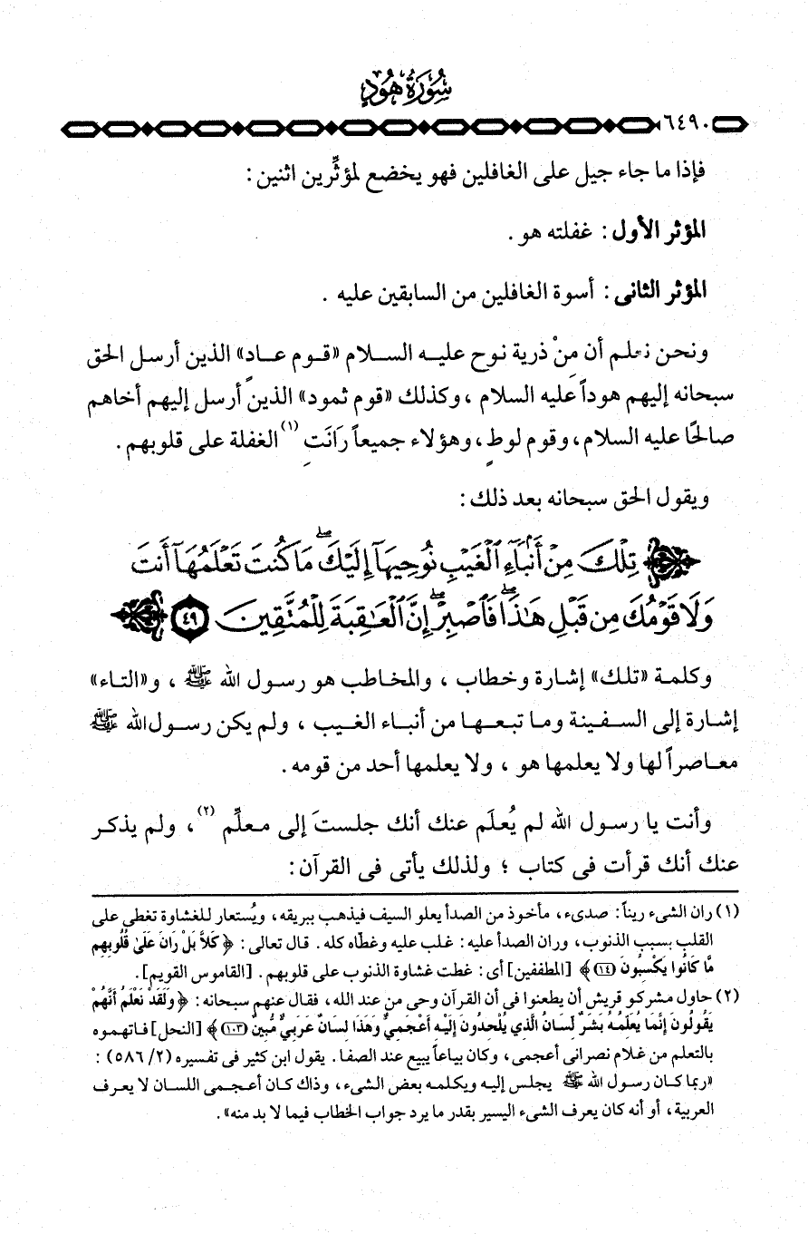 وكلمة «تلك» إشارة وخطاب، والمخاطب هو رسول الله صَلَّى اللَّهُ عَلَيْهِ وَسَلَّم َ، و «التاء» إشارة إلى السفينة وما تبعها من أنباء الغيب، ولم يكن رسول الله صَلَّى اللَّهُ عَلَيْهِ وَسَلَّم َ معاصراً لها ولا يعلمها هو، ولا يعلمها أحد من قومه.