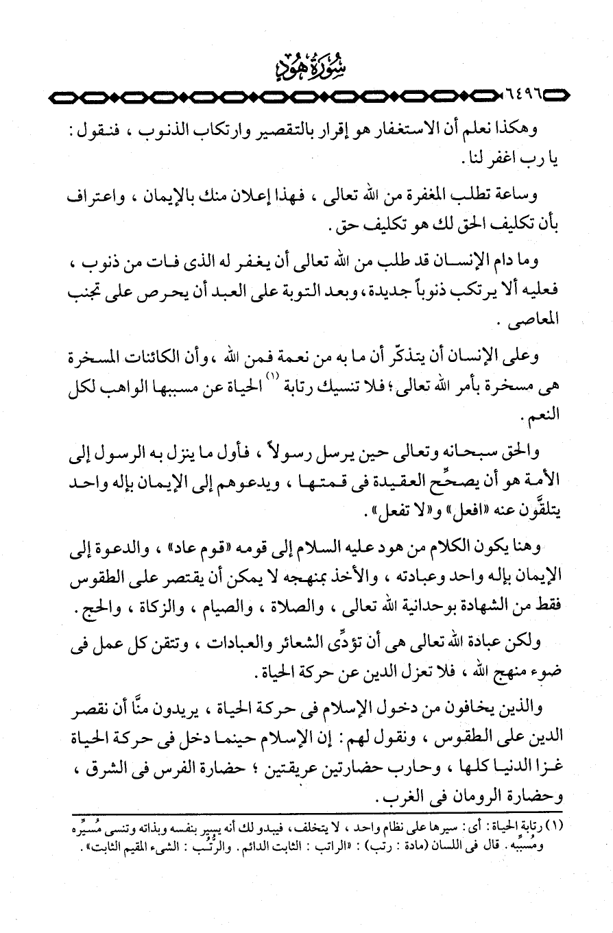 وهنا يكون الكلام من هود عليه السلام إلى قومه «قوم عاد» ، والدعوة إلى الإيمان بإله واحد وعبادته، والأخذ بمنهجه لا يمكن أن يقتصر على الطقوس فقط من الشهادة بوحدانية الله تعالى، والصلاة، والصيام، والزكاة، والحج.