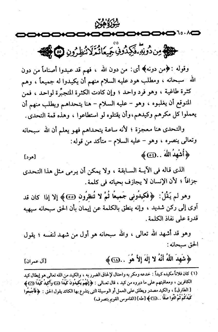 وقوله: {مِن دُونِهِ} أي: من دون الله، فهم قد عبدوا أصناماً من دون الله سبحانه، ومطلب هود عليه السلام منهم أن يكيدوا له جميعاً، وهم كثرة طاغية، وهو فرد واحد؛ وإن كادت الكثرة المتجبِّرة لواحد، فمن المتوقع أن يغلبوه، وهو عليه السلام هنا يتحداهم ويطلب منهم أن يعملوا كل مكرهم وكيدهم، وأن يقتلوه لو استطاعوا، وهذه قمة التحدي.