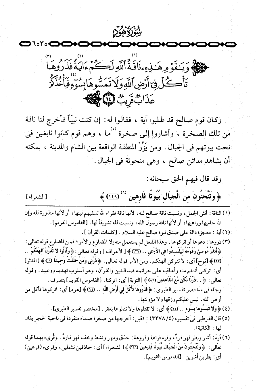 وكان قوم صالح قد طلبوا آية، فقالوا له: إن كنت نبيّاً فأخرج لنا ناقة من تلك الصخرة، وأشاروا إلى صخرة ما، وهم قوم كانوا نابغين في نحتن بيوتهم في الجبال. ومن يَزُورْ المنطقة الواقعة بين الشام والمدينة، يمكنه أن يشاهد مدائن صالح، وهي منحوتة في الجبال.