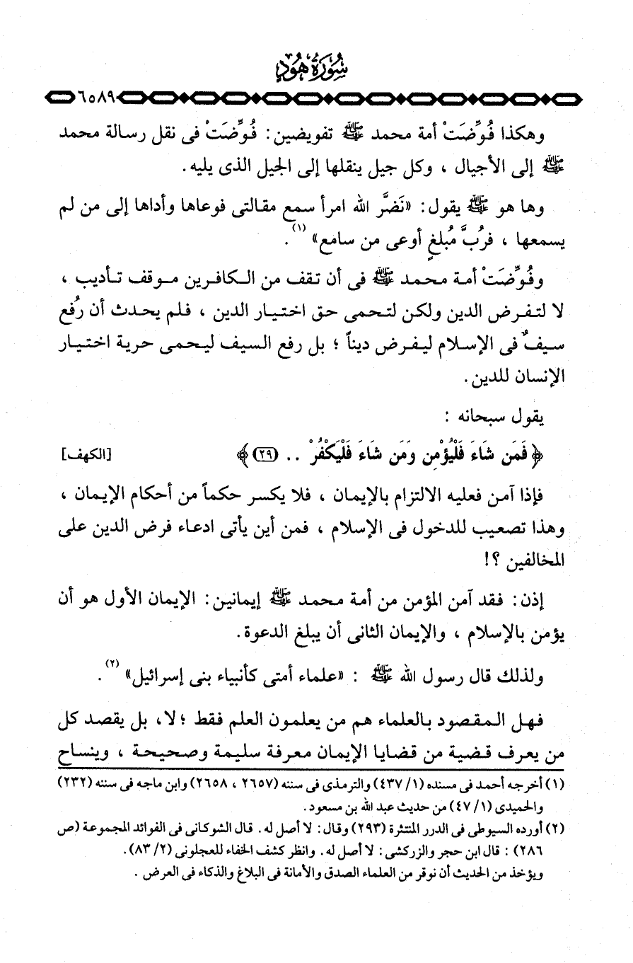 وهكذا فُوِّضَتْ أمة محمد صَلَّى اللَّهُ عَلَيْهِ وَسَلَّم َ تفويضين: فُوِّضَتْ في نقل رسالة محمد صَلَّى اللَّهُ عَلَيْهِ وَسَلَّم َ إلى الأجيال، وكل جيل ينقلها إلى الجيل الذي يليه.