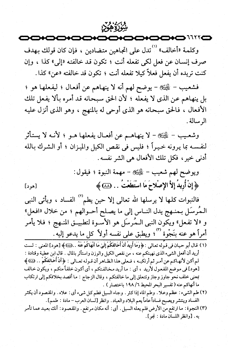 فشعيب عليه السلام يوضح لهم أنه لا ينهاهم عن أفعال؛ ليفعلها هو؛ بل ينهاهم عن الذي لا يفعله؛ لأن الحق سبحانه قد أمره بألا يفعل تلك الأفعال، فالحق سبحانه هو الذي أوحى له بالمنهج، وهو الذي أنزل عليه الرسالة.