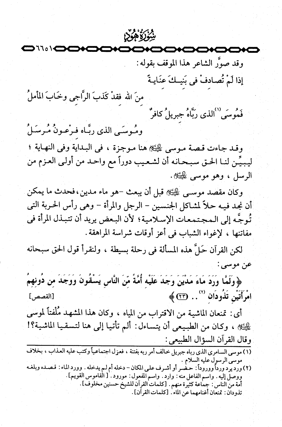وكان مقصود موسى عليه السلام قبل أن يبعث هو ماء مدين، فحدث ما يمكن أن نجد فيه حلاً لمشاكل الجنسين الرجل والمرأة وهي رأس الحربة التي تُوجَّه إلى المجتمعات الإسلامية؛ لأن البعض يريد أن تتبذل المرأة في مفاتنها، لإغواء الشباب في أعز أوقات شراسة المراهقة.