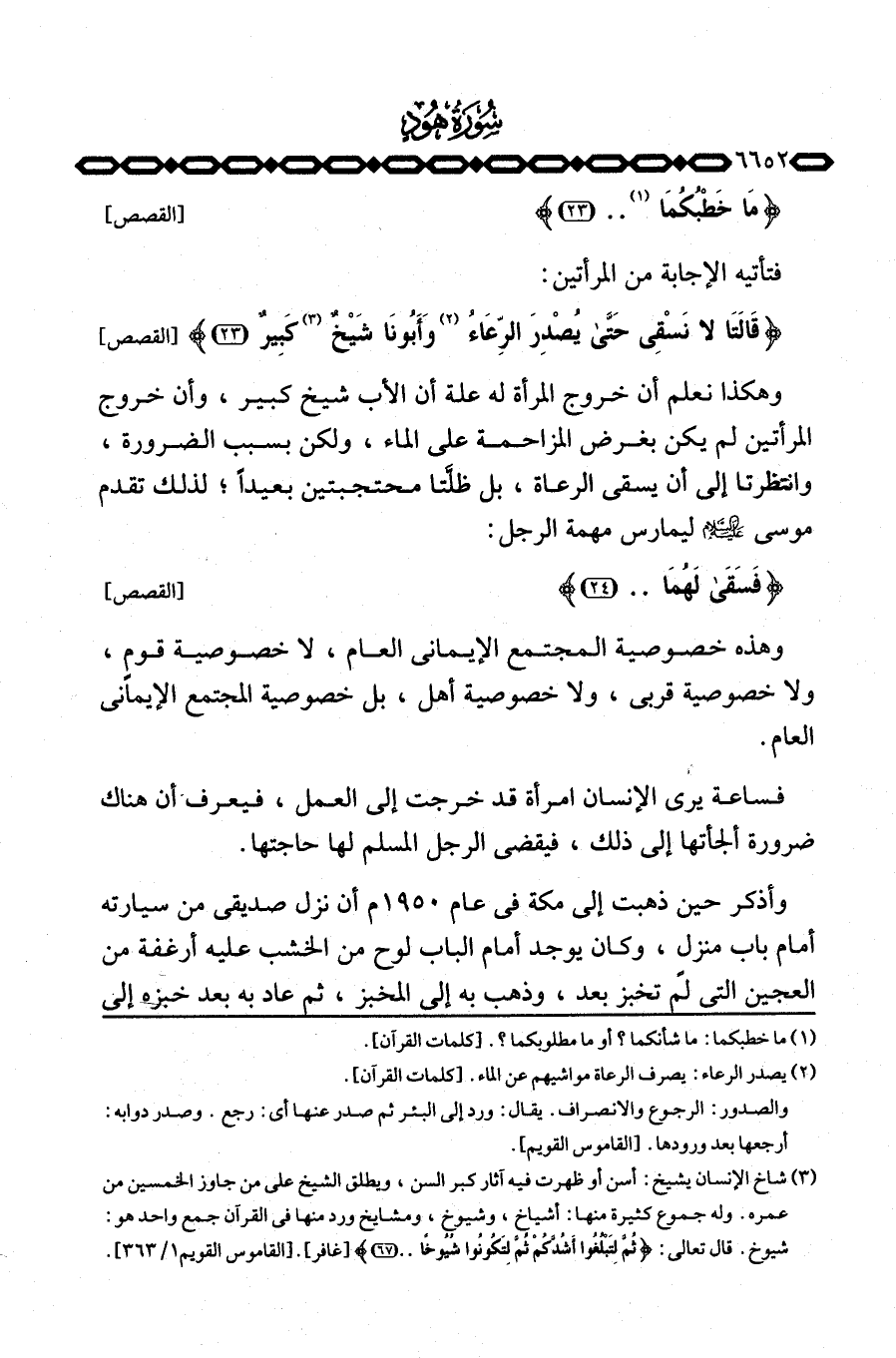 وهكذا نعلم أن خروج المرأة له علة أن الأب شيخ كبير، وأن خروج المرأتين لم يكن بغرض المزاحمة على الماء، ولكن بسبب الضرورة، وانتظرتا إلى أن يسقي الرعاة، بل ظلَّتا محتجبتين بعيداً؛ لذلك تقدم موسى عليه السلام ليمارس مهمة الرجل: