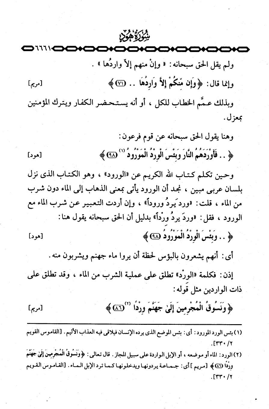 وحين تكلم كتاب الله الكريم عن «الورود» ، وهو الكتاب الذي نزل بلسان عربي مبين، نجد أن الورود يأتي بمعنى الذهاب إلى الماء دون شرب من الماء، قلت: «وردَ يردُ وروداً» ، وإن أردت التعبير عن شرب الماء مع الورود، فقل: «وردَ يردُ وِرْداً» بدليل أن الحق سبحانه يقول هنا: