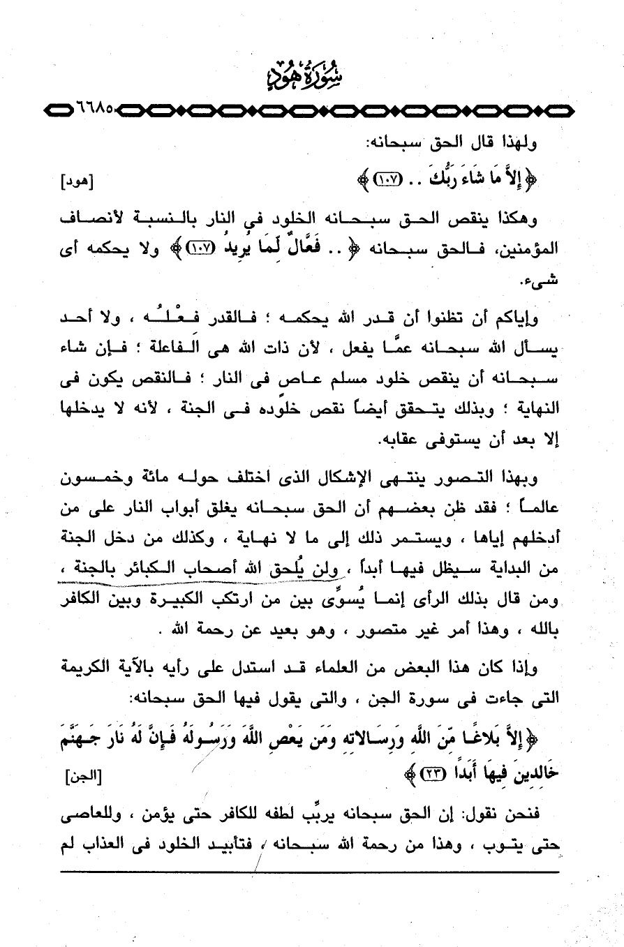 وإياكم أن تظنوا أن قدر الله يحكمه؛ فالقدر فِعْلُه، ولا أحد يسأل الله سبحانه عمَّا يفعل؛ لأن ذات الله هي الفاعلة؛ فإن شاء سبحانه أن ينقص خلود مسلم عاصٍ في النار؛ فالنقص يكون في النهاية؛ وبذلك يتحقق أيضاً نقص خلوده في الجنة، لأنه لا يدخلها إلا بعد أن يستوفي عقابه.
