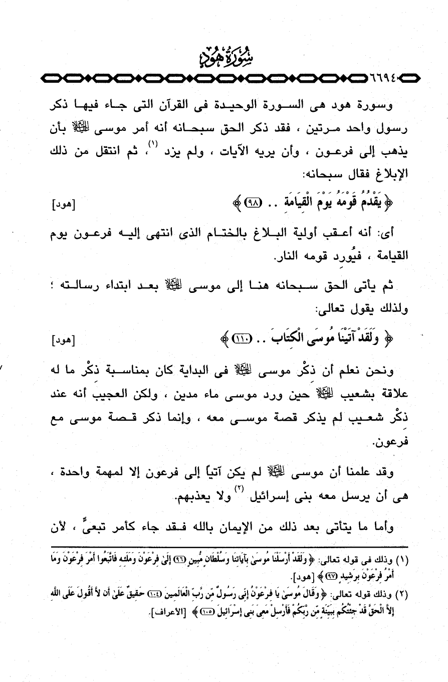 وسورة هود هي السورة الوحيدة في القرآن التي جاء فيها ذكر رسول واحد مرتين، فقد ذكر الحق سبحانه أنه أمر موسى عليه السلام بأن يذهب إلى فرعون، وأن يريه الآيات، ولم يزد، ثم انتقل من ذلك الإبلاغ فقال سبحانه: