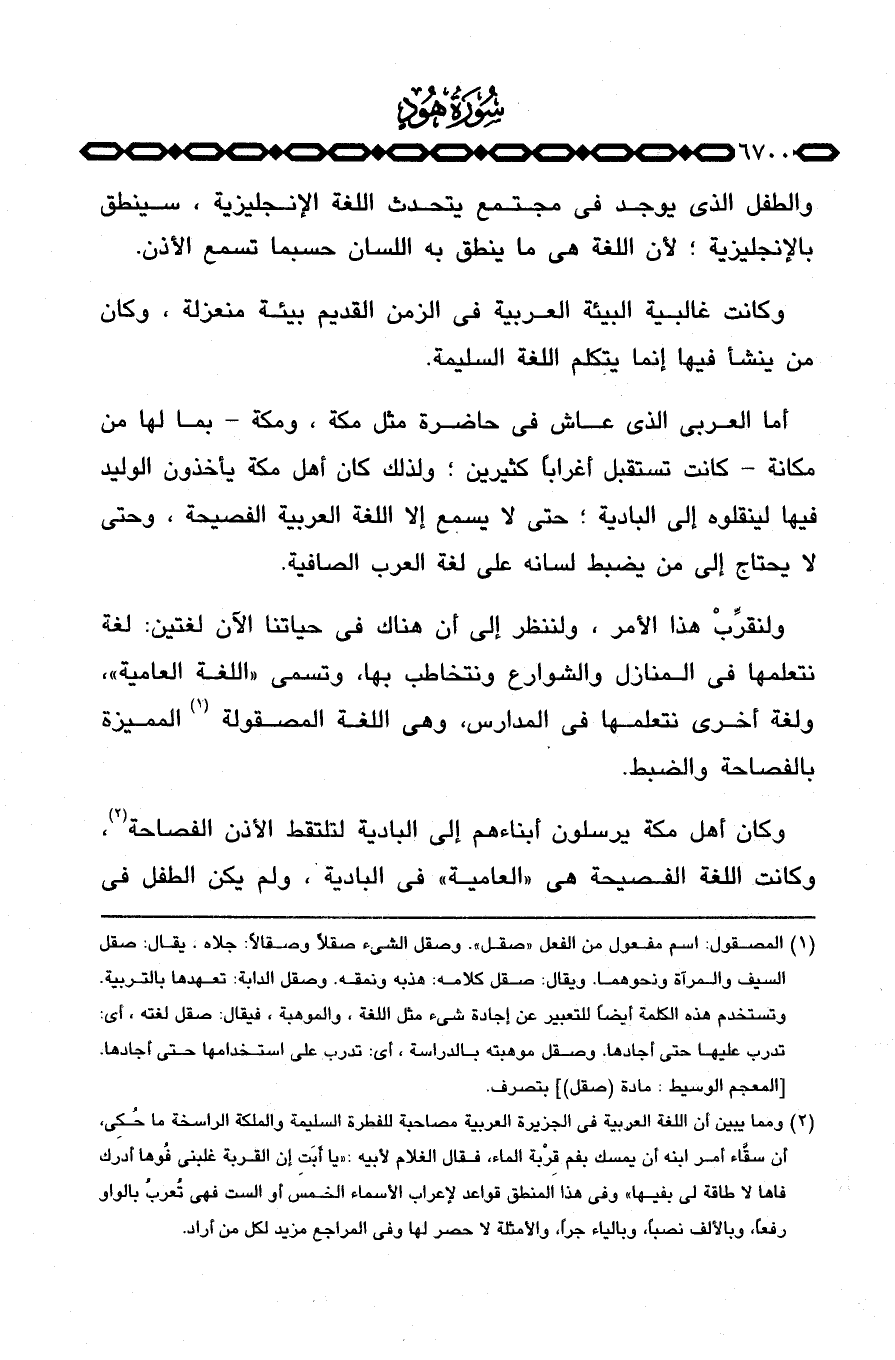 ولنقرِّبْ هذا الأمر، ولننظر إلى أن هناك في حياتنا الآن لغتين: لغة نتعلمها في المنازل والشوارع ونتخاطب بها، وتسمى «اللغة العامية» ، ولغة أخرى نتعلمها في المدارس، وهي اللغة المصقولة المميزة بالفصاحة والضبط.