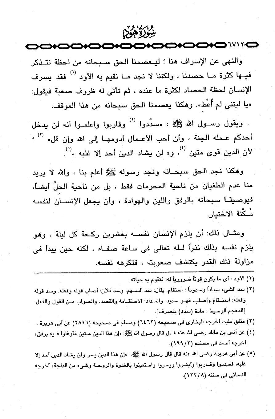 ويقول رسول الله صَلَّى اللَّهُ عَلَيْهِ وَسَلَّم َ: «سدِّدوا وقاربوا واعلموا أنه لن يدخل أحدكم عمله الجنة، وأن أحب الأعمال أدومها إلى الله وإن قل» ؛ لأن الدين قوي متين، و «لن يشاد الدين أحد إلا غلبه» .