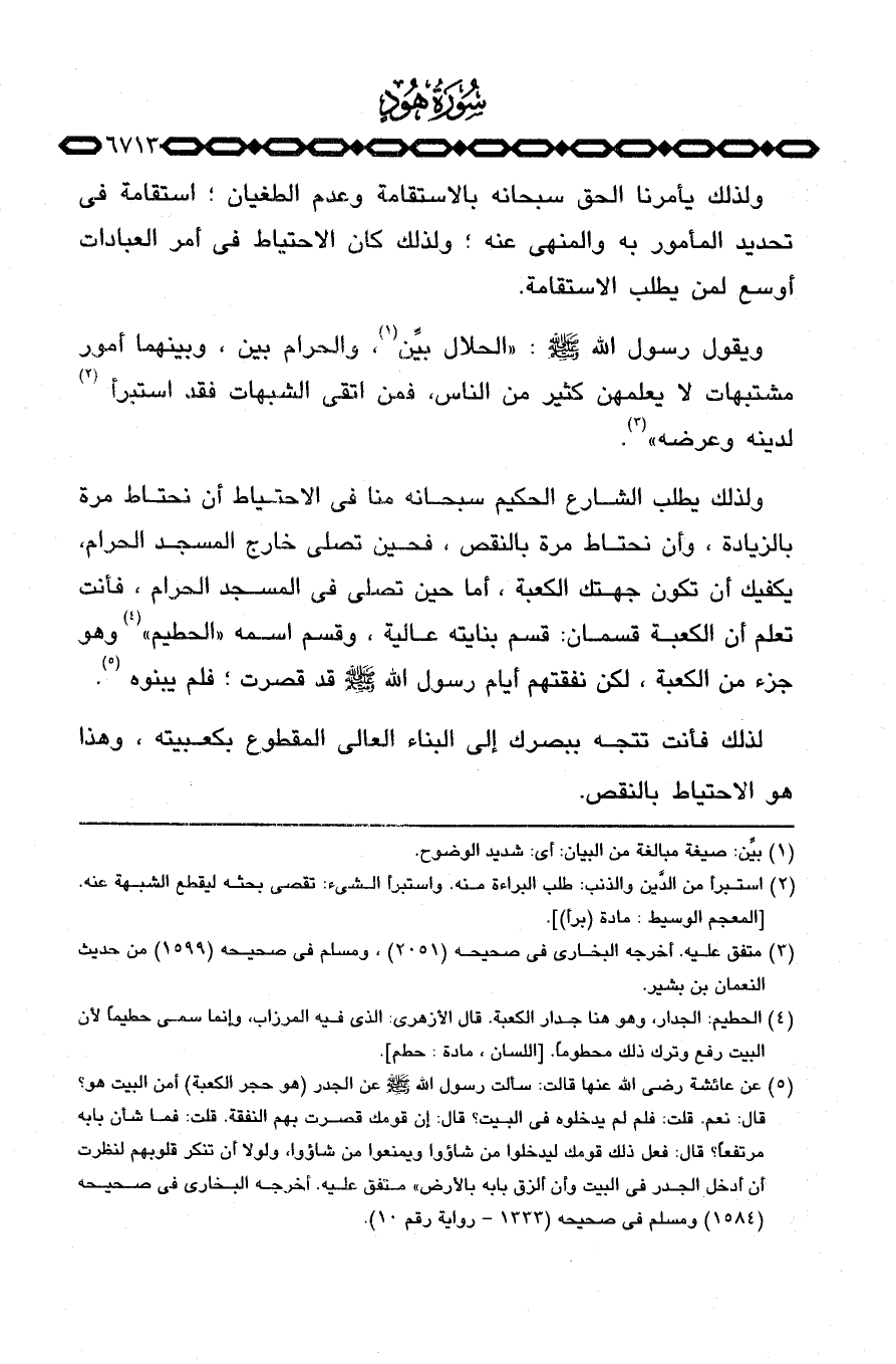 ولذلك يطلب الشارع الحكيم سبحانه منا في الاحتياط أن نحتاط مرة بالزيادة، وأن نحتاط بمرة بالنقص، فحين تصلي خارج المسجد الحرام، يكفيك أن تكون جهتك الكعبة، أما حين تصلي في المسجد الحرام، فأنت تعلم أن الكعبة قسمان: قسم بنايته عالية، وقسم اسمه «الحطيم» وهو جزء من الكعبة، لكن نفقتهم أيام رسول الله صَلَّى اللَّهُ عَلَيْهِ وَسَلَّم َ قد قصرت؛ فلم يبنوه.