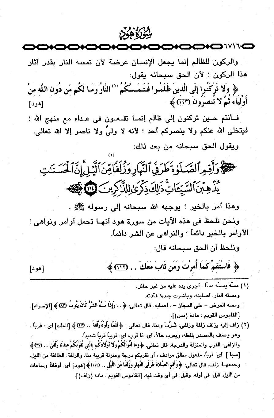 {وَلاَ تركنوا إِلَى الذين ظَلَمُواْ فَتَمَسَّكُمُ النار وَمَا لَكُمْ مِّن دُونِ الله مِنْ أَوْلِيَآءَ ثُمَّ لاَ تُنصَرُونَ} [هود: 113] .
