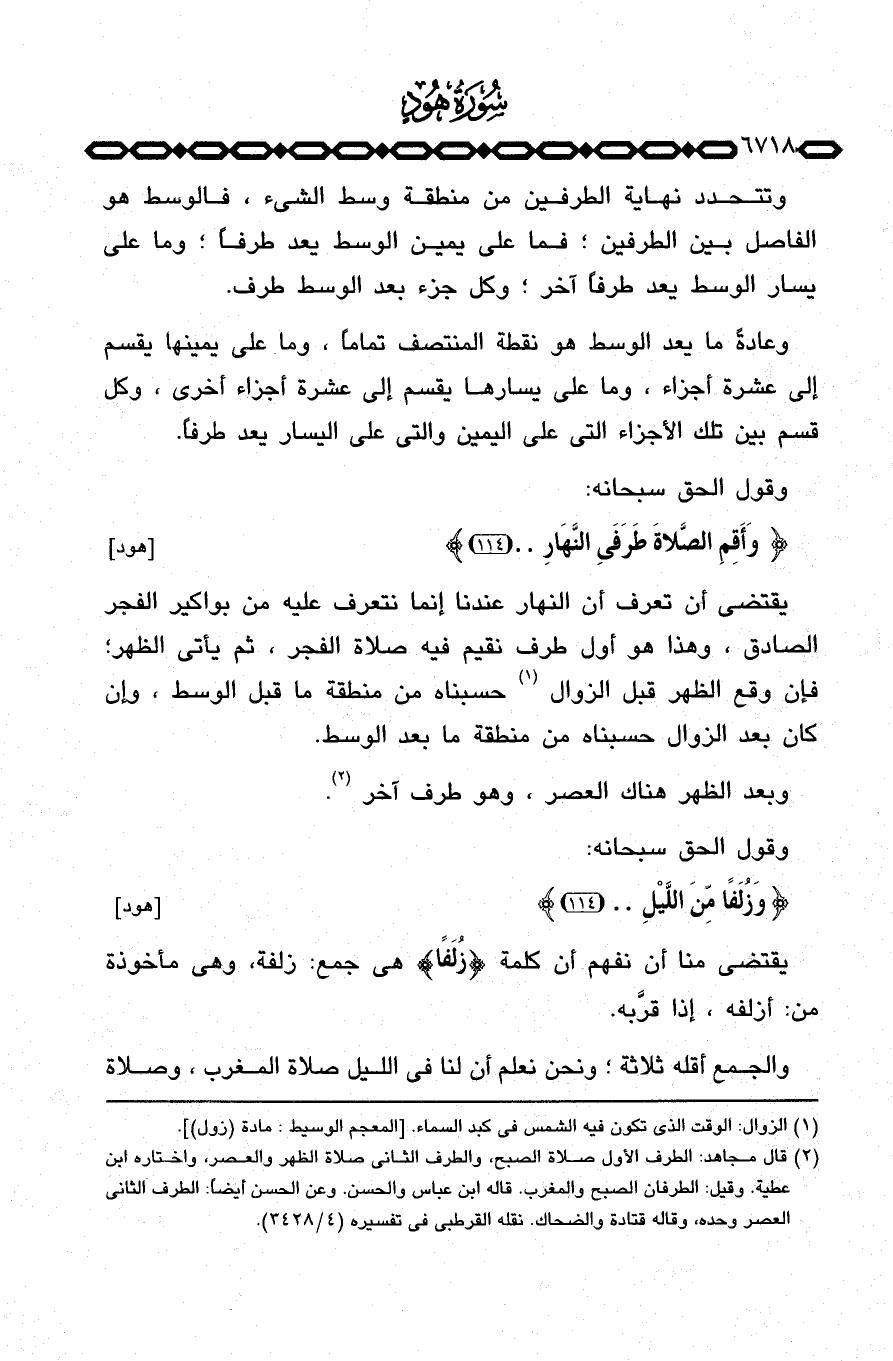 يقتضي أن تعرف أن النهار عندنا إنما نتعرف عليه من بواكير الفجر الصادق، وهذا هو أول طرف نقيم فيه صلاة الفجر، ثم يأتي الظهر؛ فإن وقع الظهر قبل الزوال حسبناه من منطقة ما قبل الوسط، وإن كان بعد الزوال حسبناه من منطقة ما بعد الوسط.