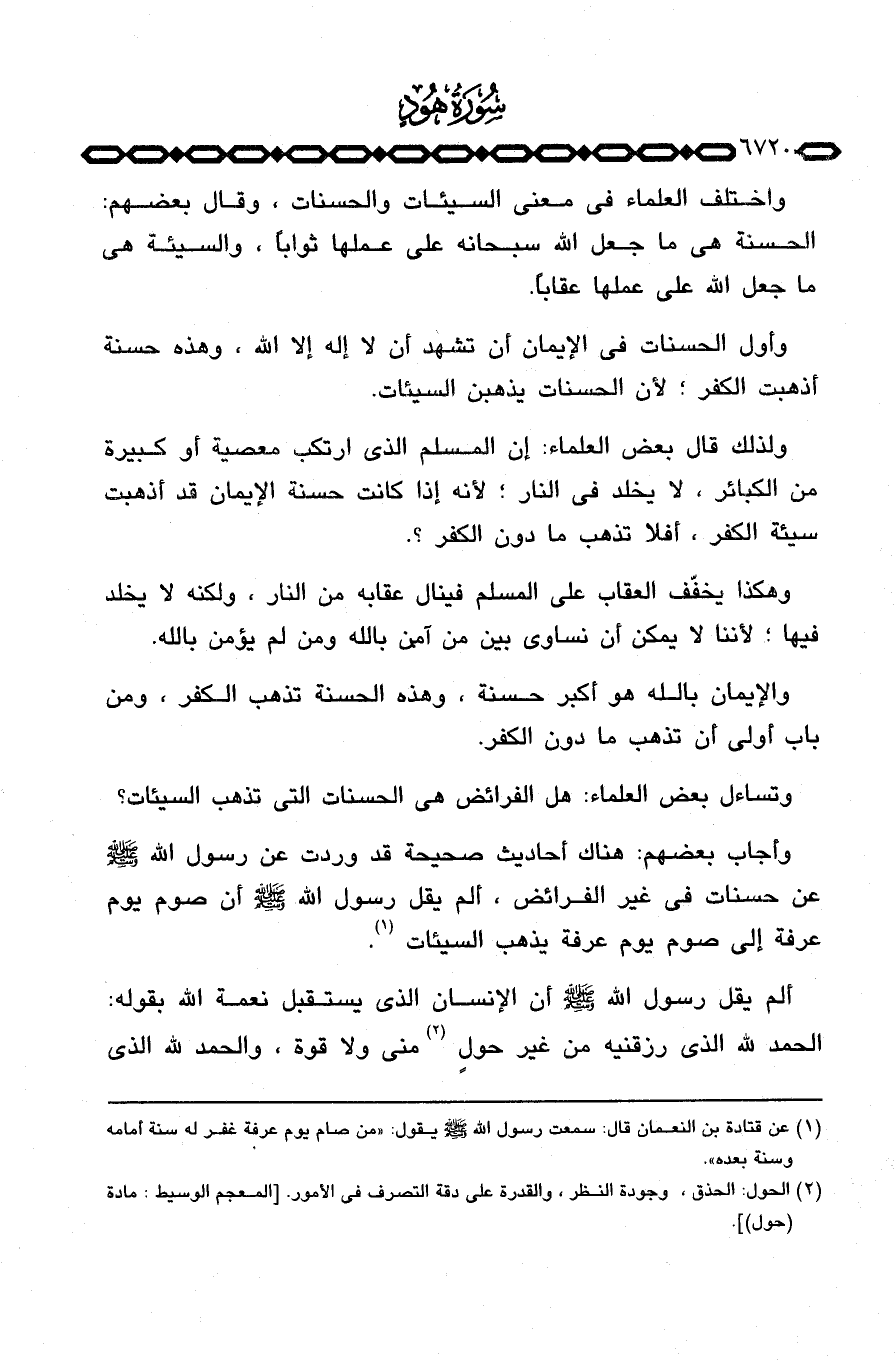 واختلف العلماء في معنى السيئات والحسنات، وقال بعضهم: الحسنة هي ما جعل الله سبحانه على عملها ثواباً، والسيئة هي ما جعل الله على عملها عقاباً.