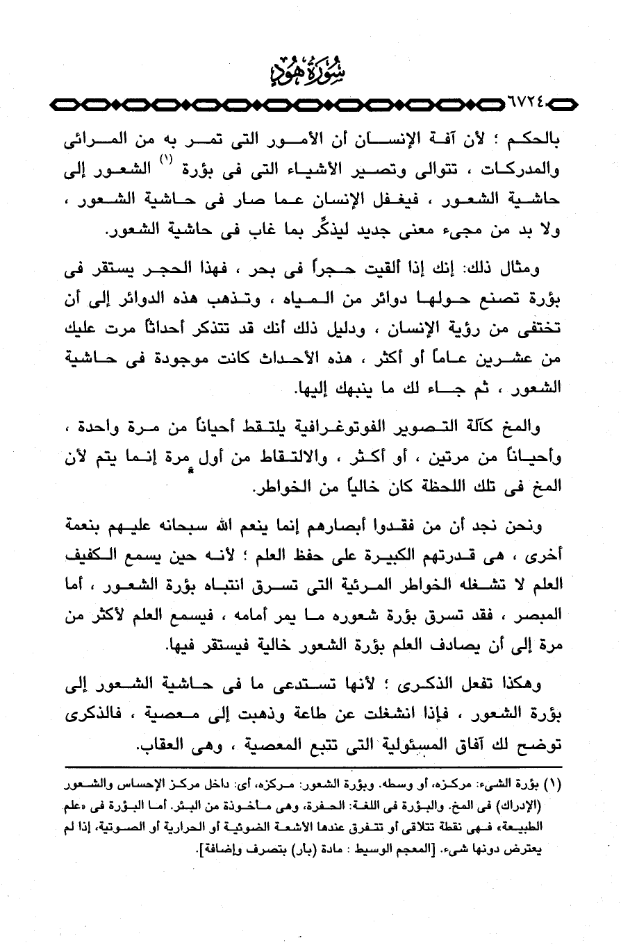 وهكذا تفعل الذكرى؛ لأنها تستدعي ما في حاشية الشعور إلى بؤرة الشعور، فإذا انشغلت عن طاعة وذهبت إلى معصية، فالذكرى توضح لك آفاق المسئولية التي تتبع المعصية، وهي العقاب.