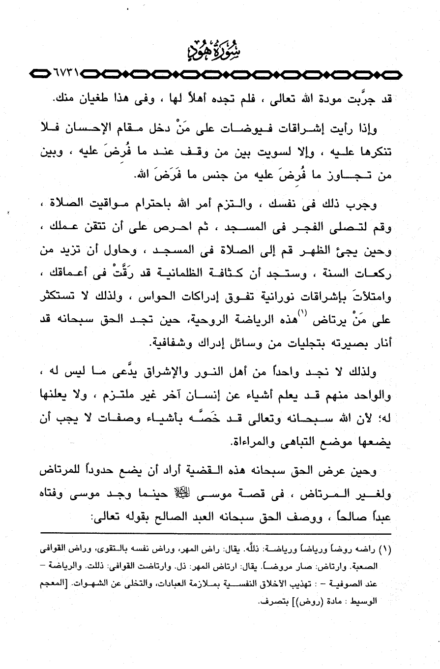 وجرب ذلك في نفسك، والتزم أمر الله باحترام مواقيت الصلاة، وقم لتصلي الفجر في المسجد، ثم احرص على أن تتقن عملك، وحين يجيء الظهر قم إلى الصلاة في المسجد، وحاول أن تزيد من ركعات السنة، وستجد أن كثافة الظلمانية قد رَقَّتْ في أعماقك، وامتلأتَ بإشراقات نوارينة تفوق إدراكات الحواس، ولذلك لا تستكثر على مَنْ يرتاض هذه الرياضة الروحية، حين تجد الحق سبحانه قد أنار بصيرته بتجليات من وسائل إدراك وشفافية.