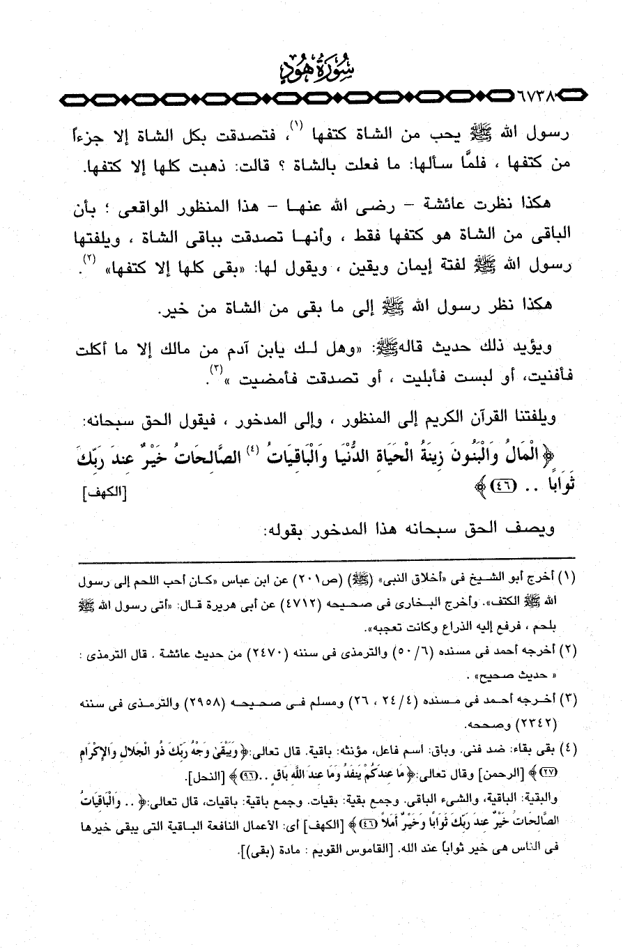 هكذا نظرت عائشة رَضِيَ اللَّهُ عَنْها هذا المنظور الواقعي؛ بأن الباقي من الشاة هو كتفها فقط، وأنها تصدقت بباقي الشاة، ويلفتها رسول الله صَلَّى اللَّهُ عَلَيْهِ وَسَلَّم َ لفتة إيمان ويقين، ويقول لها: «بقى كلها إلا كتفها» .