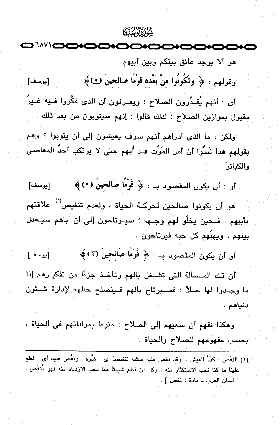 أو: أن يكون المقصود ب: {قَوْماً صَالِحِينَ} [يوسف: 9] ، هو أن يكونوا صالحين لحركة الحياة، ولعدم تنغيص علاقتهم بأبيهم؛ فحين يخلُو لهم وجهه؛ سيرتاحون إلى أن أباهم سيعدل بينهم، ويهبُهم كل حبه فيرتاحون.