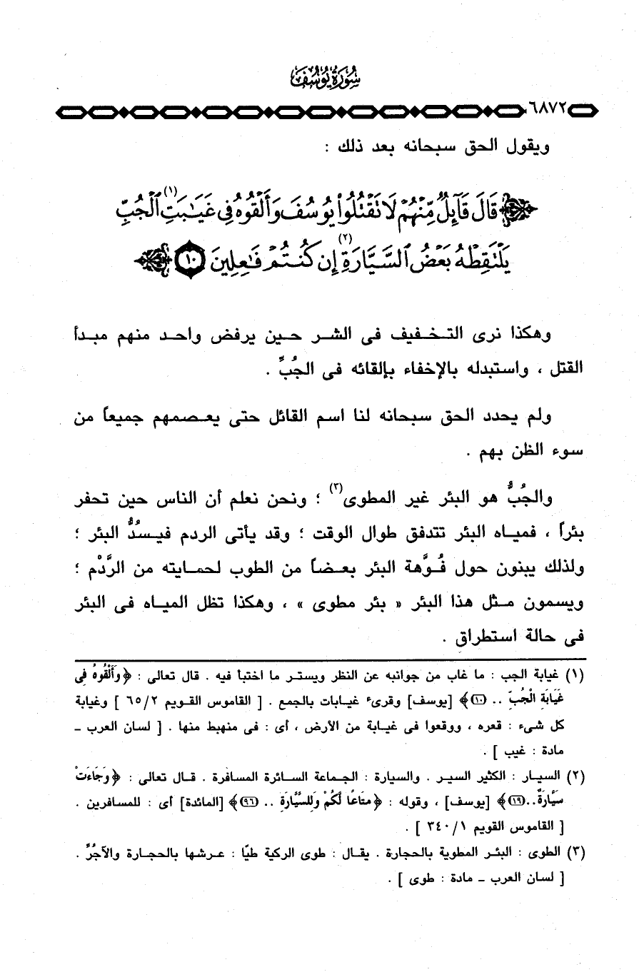 والجب هو البئر غير المطوي؛ ونحن نعلم أن الناس حين تحفر بئراً، فمياه البئر تتدفق طوال الوقت؛ وقد يأتي الردم فيسُدُّ البئر؛ ولذلك يبنون حول فُوَّهة البئر بعضاً من الطوب لحمايته من الرَّدْم؛ ويسمون مثل هذا البئر «بئر مطوي» ، وهكذا تظل المياه في البئر في حالة استطراق.