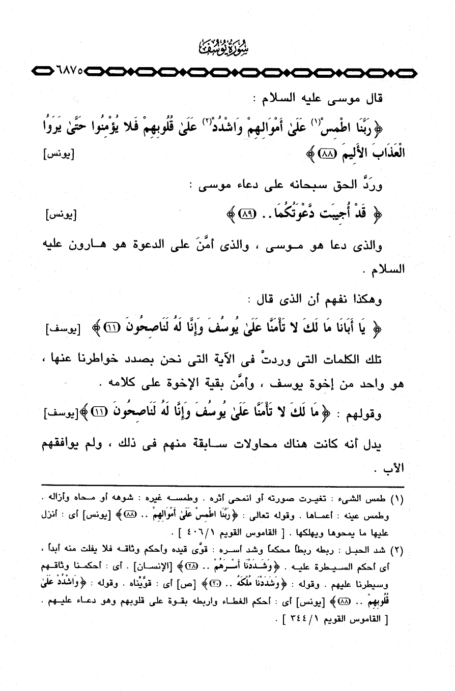 قال موسى عليه السلام: {وَقَالَ موسى رَبَّنَآ إِنَّكَ آتَيْتَ فِرْعَوْنَ وَمَلأَهُ زِينَةً وَأَمْوَالاً فِي الحياة الدنيا رَبَّنَا لِيُضِلُّواْ عَن سَبِيلِكَ رَبَّنَا اطمس على أَمْوَالِهِمْ واشدد على قُلُوبِهِمْ فَلاَ يُؤْمِنُواْ حتى يَرَوُاْ العذاب الأليم} [يونس: 88] .