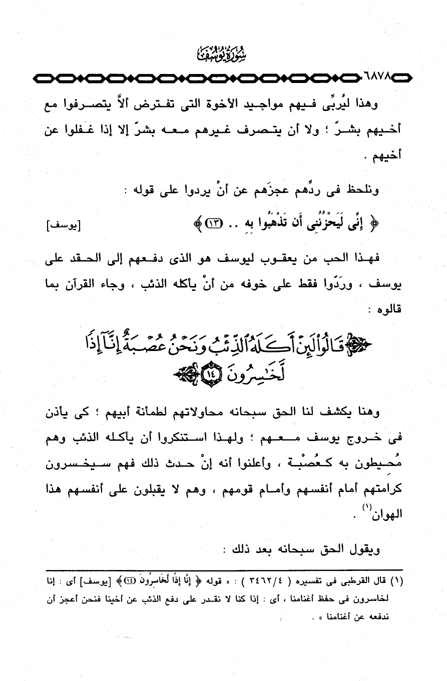 وهنا يكشف لنا الحق سبحانه محاولاتهم لطمأنة أبيهم؛ كي يأذن في خروج يوسف معهم؛ ولهذا استنكروا أن يأكله الذئب وهم مُحِيطون به كعُصْبة، وأعلنوا أنه إنْ حدث ذلك فهم سيخسرون كرامتهم أمام أنفسهم وأمام قومهم، وهم لا يقبلون على أنفسهم هذا الهوان.