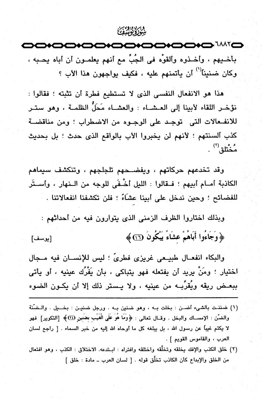 هذا هو الانفعال النفسي الذي لا تستطيع فطرة أن تثبته؛ فقالوا: نؤخر اللقاء لأبينا إلى العشاء: والعشاء مَحَلُّ الظلمة، وهو ستر للانفعالات التي توجد على الوجوه من الاضطراب؛ ومن مناقضة كذب ألسنتهم؛ لأنهم لن يخبروا الأب بالواقع الذي حدث؛ بل بحديث مُخْتلق.