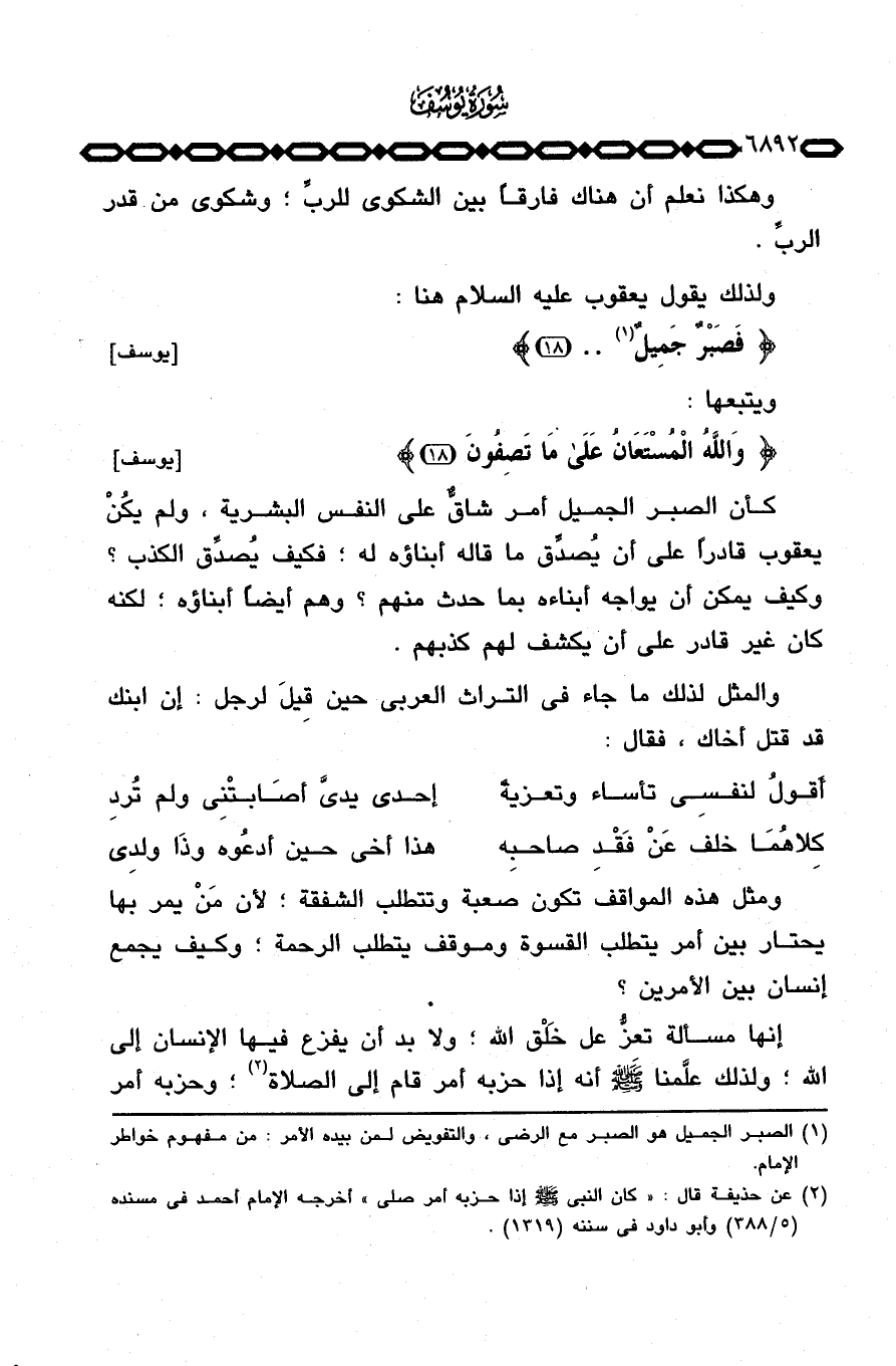 {فَصَبْرٌ جَمِيلٌ. .} [يوسف: 18] ، ويتبعها: {والله المستعان على مَا تَصِفُونَ} [يوسف: 18] ، كأن الصبر الجميل أمر شاقٌّ على النفس البشرية، ولم يكُنْ يعقوب قادراً على أن يُصدِّق ما قاله أبناؤه له؛ فكيف يُصدِّق الكذب؟ وكيف يمكن أن يواجه أبناءه بما حدث منهم؟ وهم أيضاً أبناؤه؛ لكنه كان غير قادر على أن يكشف لهم كذبهم.