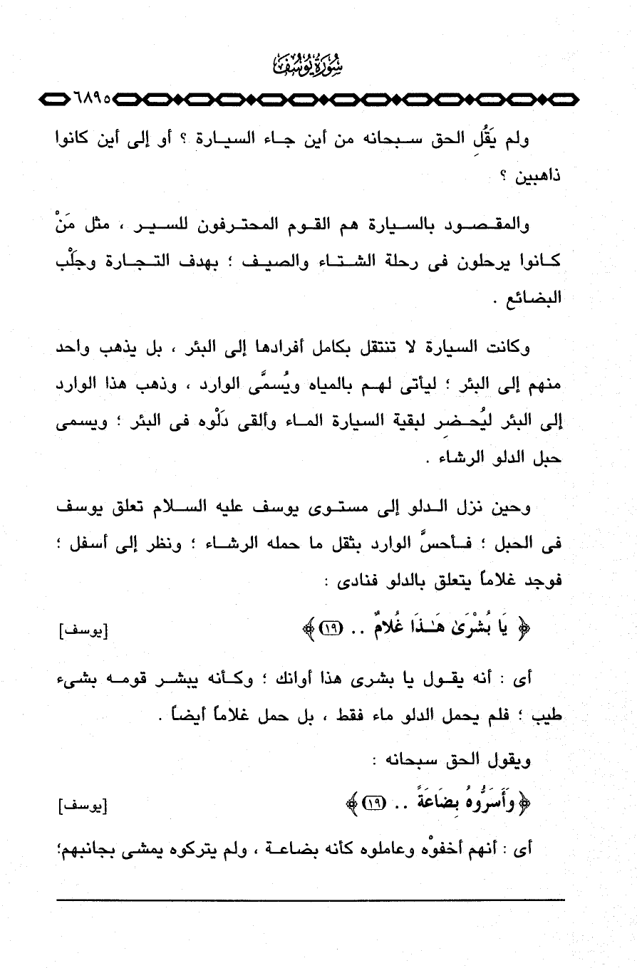 وحين نزل الدلو إلى مستوى يوسف عليه السلام تعلق يوسف في الحبل؛ فأحسَّ الوارد بثقل ما حمله الرشاء؛ ونظر إلى أسفل؛ فوجد غلاماً يتعلق بالدلو فنادى: