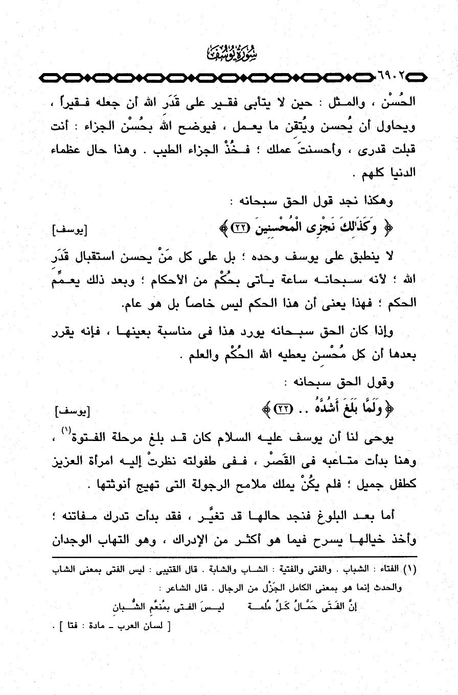 يوحي لنا أن يوسف عليه السلام كان قد بلغ مرحلة الفتوة، وهنا بدأت متاعبه في القَصْر، ففي طفولته نظرتْ إليه امرأة العزيز كطفل جميل؛ فلم يكُنْ يملك ملامح الرجولة التي تهيج أنوثتها.