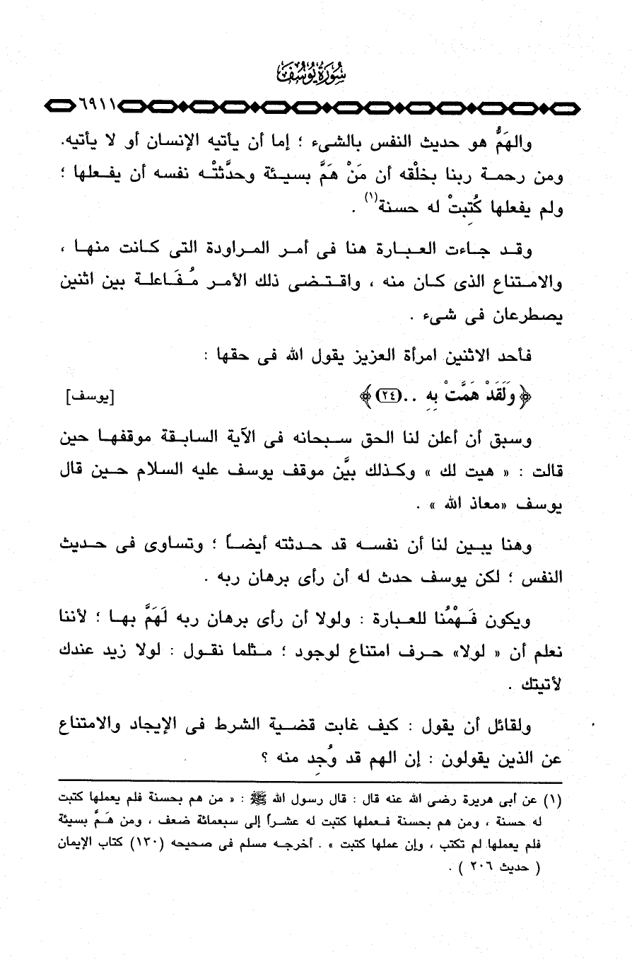 ويكون فَهْمُنا للعبارة: ولولا أن رأى برهان ربه لَهَمَّ بها؛ لأننا نعلم أن «لولا» حرف امتناع لوجود؛ مثلما نقول: لولا زيد عندك لأتيتك.