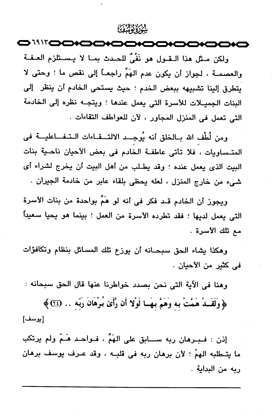 ولكن مثل هذا القول هو نَفْيٌ للحدث بما لا يستلزم العفة والعصمة، لجواز أن يكون عدم الهَمِّ راجعاً إلى نقص ما؛ وحتى لا يتطرق إلينا تشبيهه ببعض الخدم؛ حيث يستحي الخادم أن ينظر إلى البنات الجميلات للأسرة التي يعمل عندها؛ ويتجه نظره إلى الخادمة التي تعمل في المنزل المجاور، لأن للعواطف التقاءات.