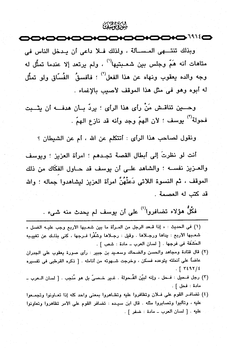 وبذلك تنتهي المسألة، ولذلك فلا داعي أن يدخل الناس في متاهات أنه هَمّ وجلس بين شعبتيها، ولم يرتعد إلا عندما تمثِّل له وجه والده يعقوب ونهاه عن هذا الفعل؛ فأفسقُ الفُسّاق ولو تمثَّل له أبوه وهو في مثل هذا الموقف لأصيب بالإغماء.