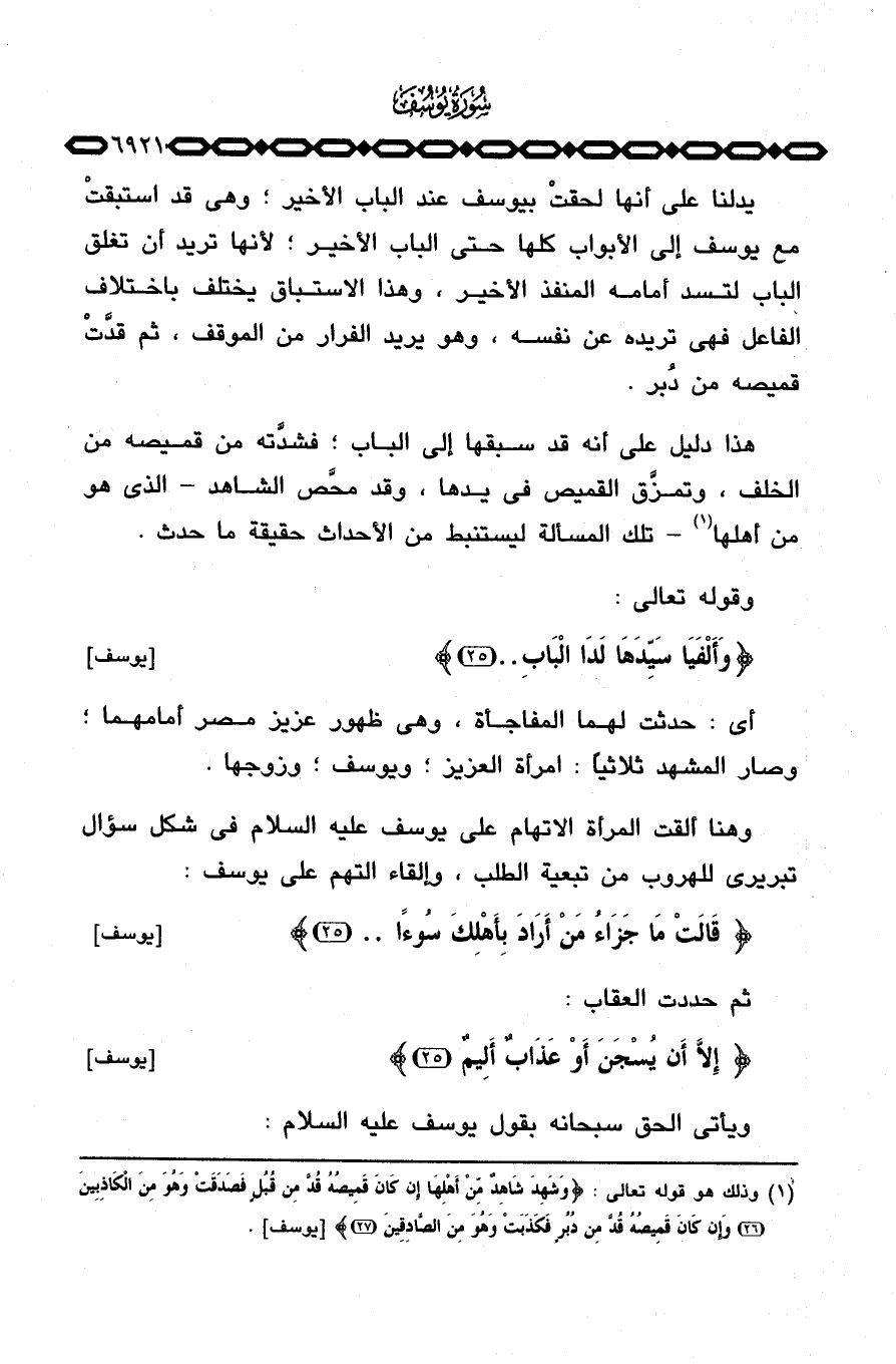 هذا دليل على أنه قد سبقها إلى الباب؛ فشدَّته من قميصه من الخلف، وتمزَّق القميص في يدها، وقد محَّص الشاهد الذي هو من أهلها تلك المسألة ليستنبط من الأحداث حقيقة ما حدث.