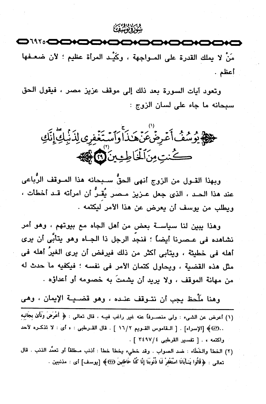 وتعود آيات السورة بعد ذلك إلى موقف عزيز مصر، فيقول الحق سبحانه ما جاء على لسان الزوج: {يُوسُفُ أَعْرِضْ ... } .