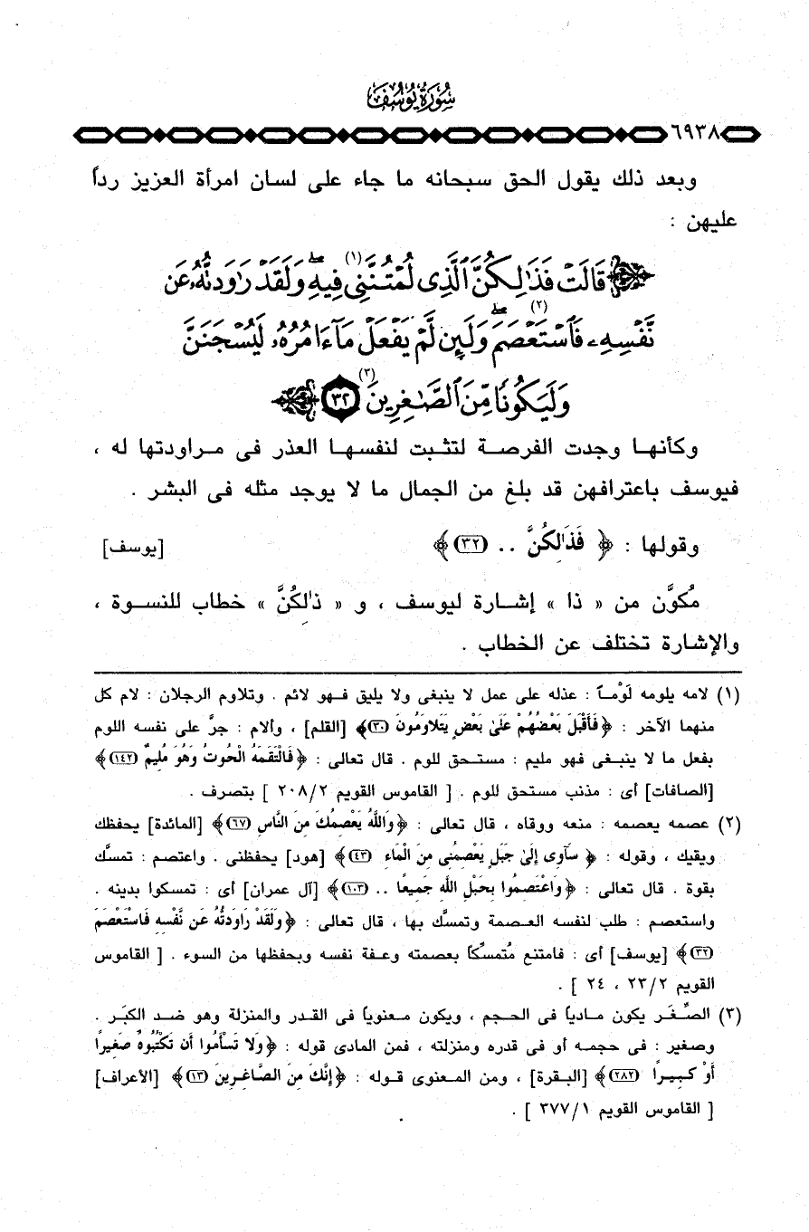 وقولها: {فذلكن} [يوسف: 32] ، مُكوَّن من «ذا» إشارة ليوسف، و «ذلِكُنَّ» خطاب للنسوة، والإشارة تختلف عن الخطاب.