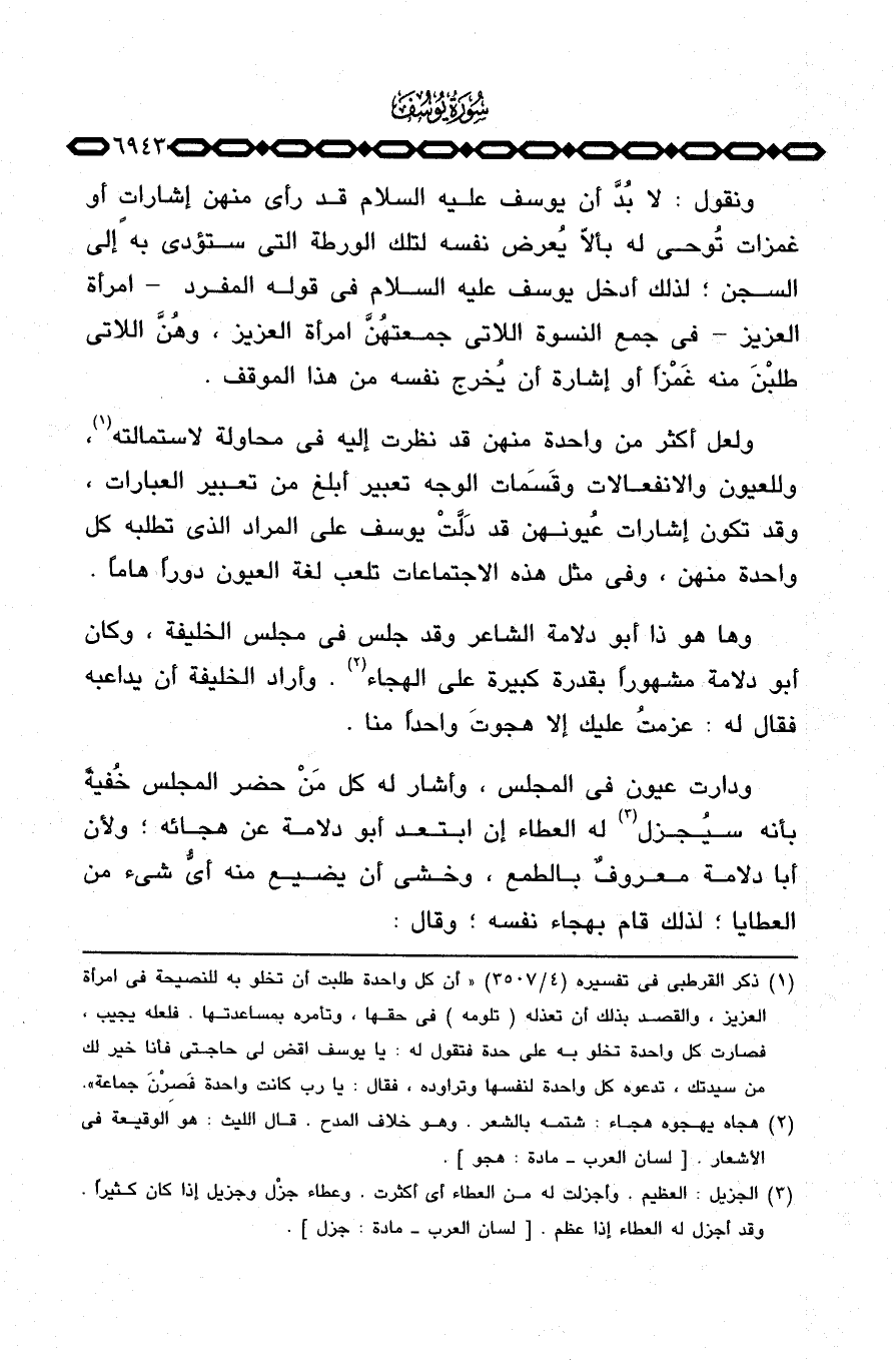 ولعل أكثر من واحدة منهن قد نظرت إليه في محاولة لاستمالته، وللعيون والانفعالات وقَسَمات الوجه تعبير أبلغ من تعبير العبارات، وقد تكون إشارات عُيونهن قد دَلَّتْ يوسف على المراد الذي تطلبه كل واحدة منهن، وفي مثل هذه الاجتماعات تلعب لغة العيون دوراً هاماً.