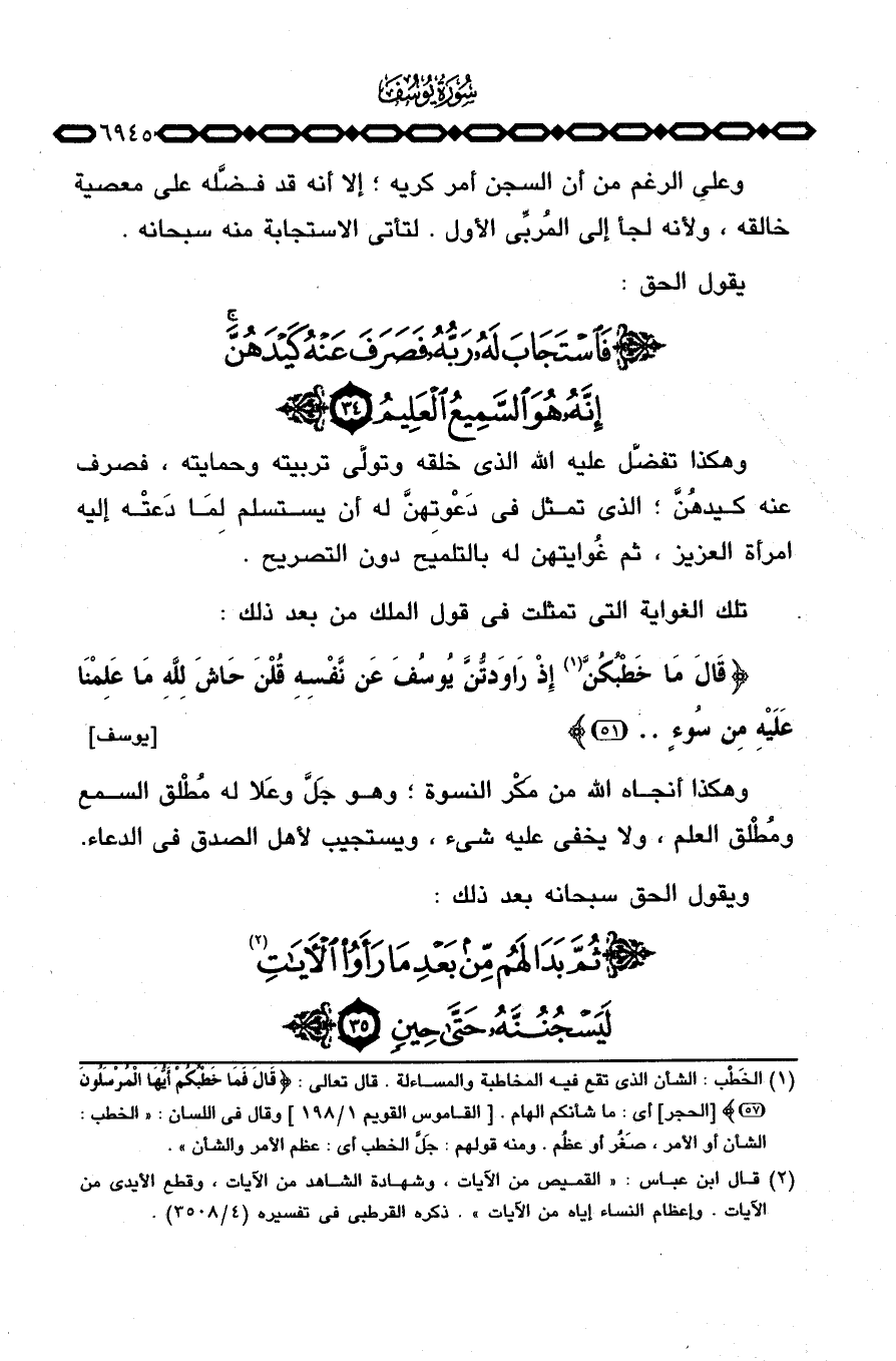 وهكذا تفضَّل عليه الله الذي خلقه وتولّى تربيته وحمايته، فصرف عنه كيدهُنَّ؛ الذي تمثل في دَعْوتِهنَّ له أن يستسلم لِمَا دَعتْه إليه امرأة العزيز، ثم غُوايتهن له بالتلميح دون التصريح.