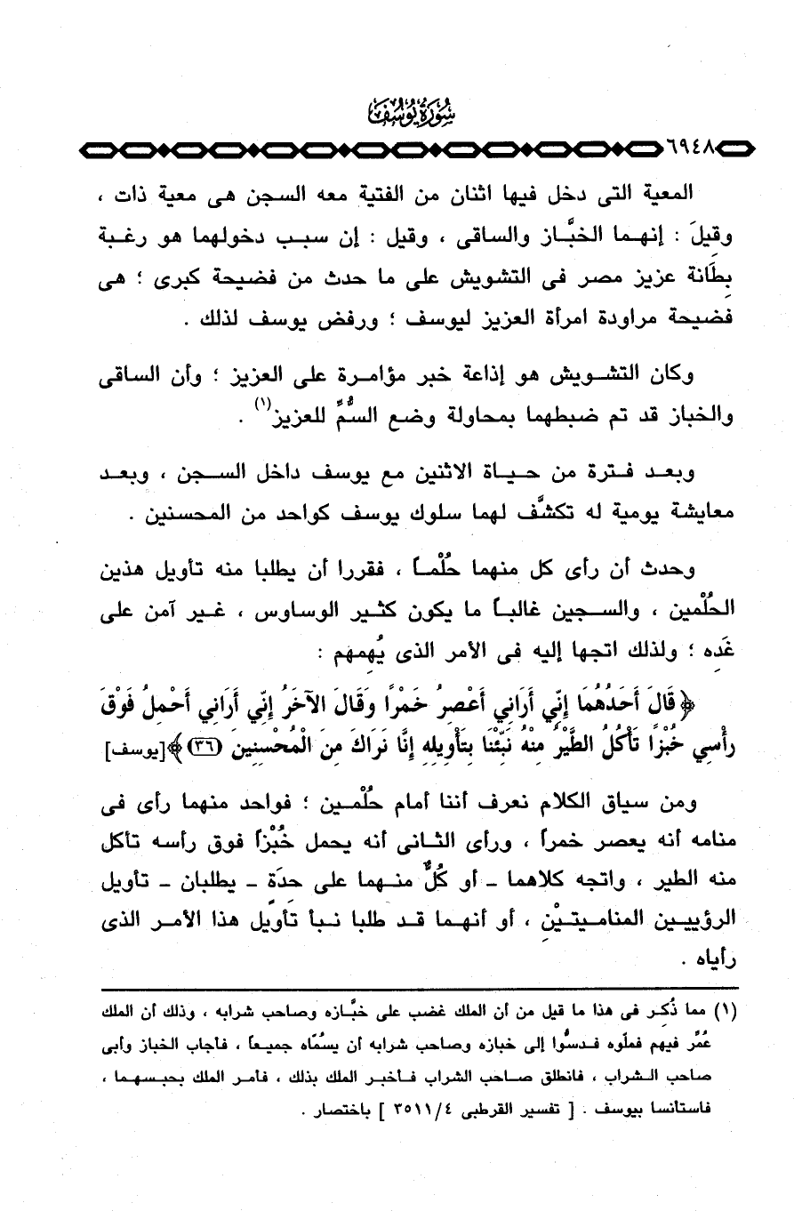 وحدث أن رأى كل منهما حُلْماً، فقررا أن يطلبا منه تأويل هذين الحُلْمين، والسجين غالباً ما يكون كثير الوساوس، وغير آمن على غَدِه؛ ولذلك اتجها إليه في الأمر الذي يُهِمهم:
