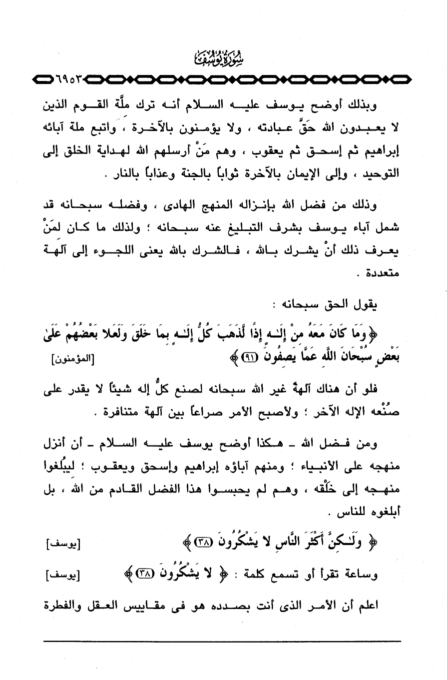 ومن فضل الله هكذا أوضح يوسف عليه السلام أن أنزل منهجه على الأنبياء؛ ومنهم آباؤه إبراهيم وإسحق ويعقوب؛ لِيُبلغوا منهجه إلى خَلْقه، وهم لم يحبسوا هذا الفضل القادم من الله، بل أبلغوه للناس.