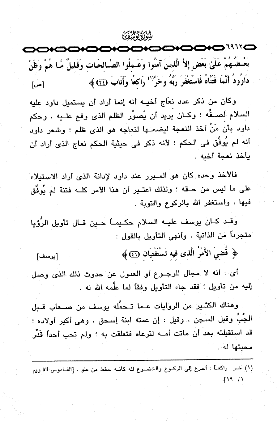 بَعْضُهُمْ على بَعْضٍ إِلاَّ الذين آمَنُواْ وَعَمِلُواْ الصالحات وَقَلِيلٌ مَّا هُمْ وَظَنَّ دَاوُودُ أَنَّمَا فَتَنَّاهُ فاستغفر رَبَّهُ وَخَرَّ رَاكِعاً وَأَنَابَ} [ص: 21 - 24] .