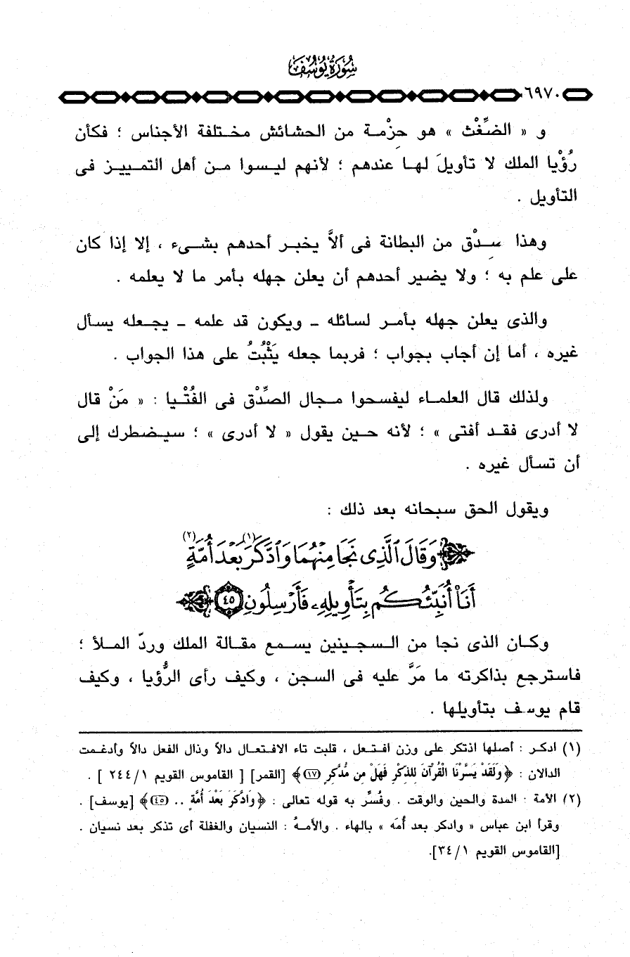 وكان الذي نجا من السجينين يسمع مقالة الملك وردّ الملأ؛ فاسترجع بذاكرته ما مَرَّ عليه في السجن، وكيف رأى الرُّؤيا، وكيف قام يوسف بتأويلها.