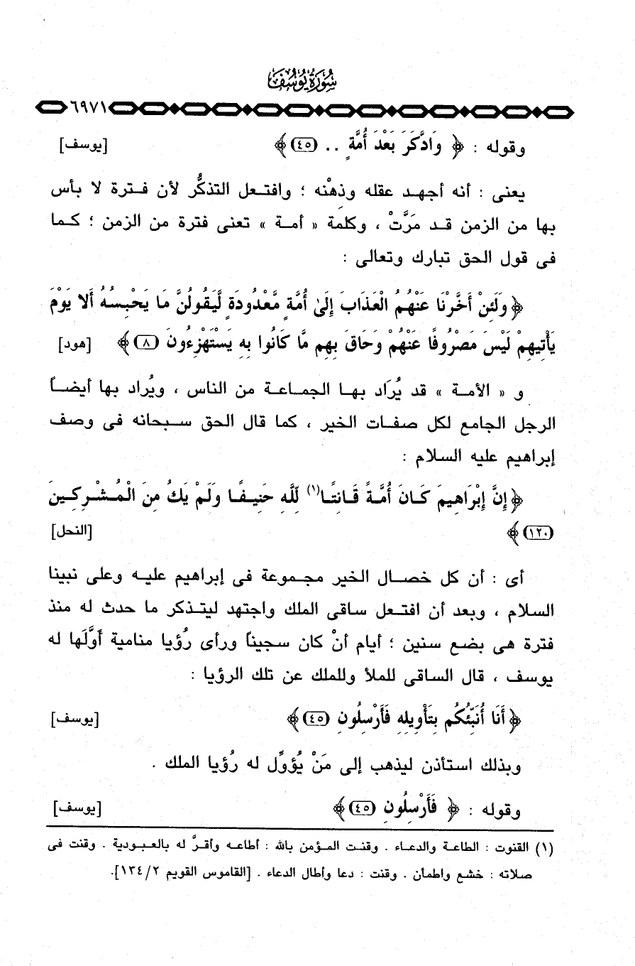 أي: أن كل خصال الخير مجموعة في إبراهيم عليه وعلى نبينا السلام، وبعد أن افتعل ساقي الملك واجتهد ليتذكر ما حدث له منذ فترة هي بضع سنين؛ أيام أنْ كان سجيناً ورأى رُؤيا منامية أوَّلَها له يوسف، قال الساقي للملأ وللملك عن تلك الرؤيا: