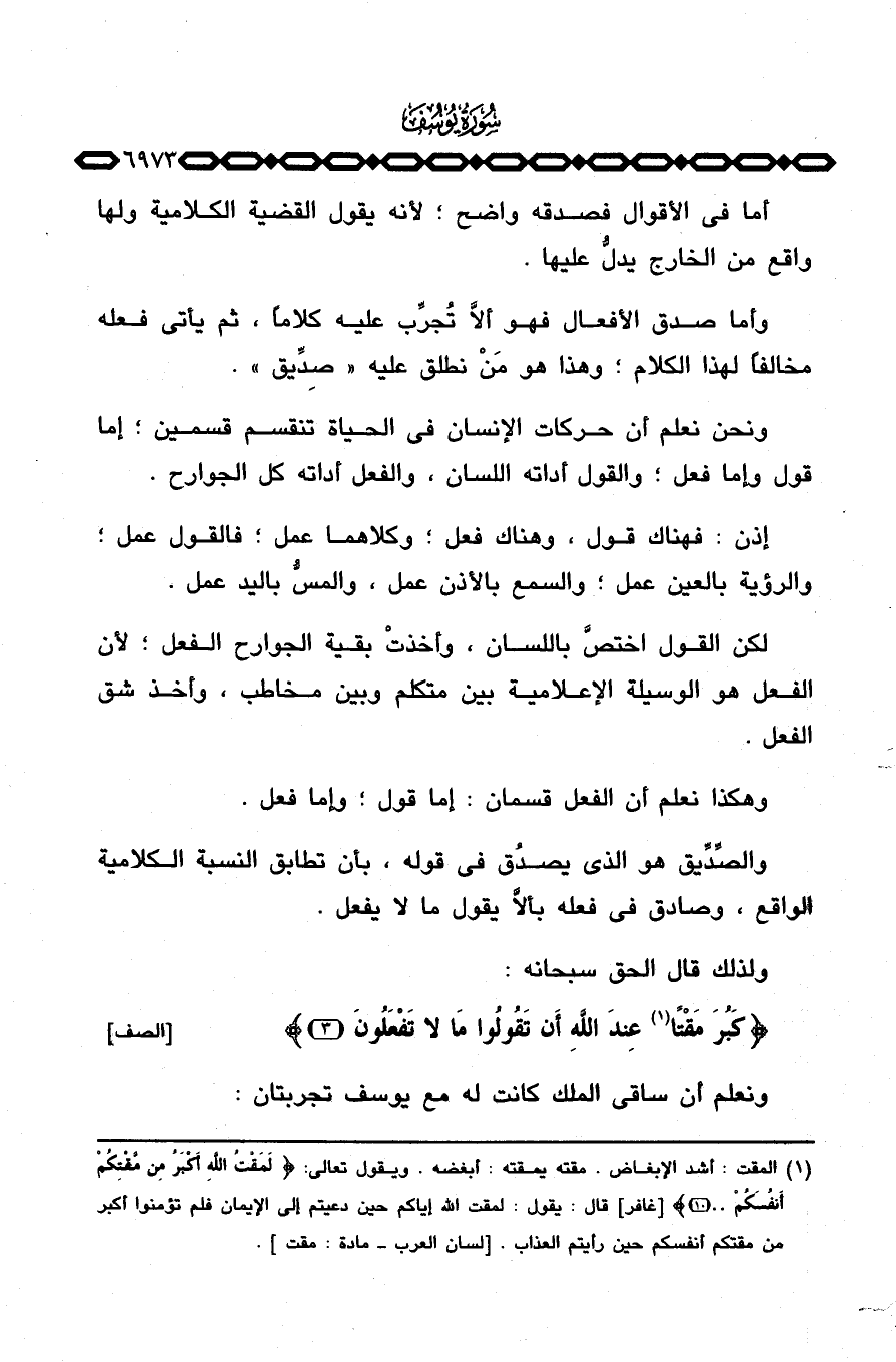 وأما صدق الأفعال فهو ألاَّ تُجرِّب عليه كلاماً، ثم يأتي فعله مخالفاً لهذا الكلام؛ وهذا هو مَنْ نطلق عليه «صِدِّيق» .