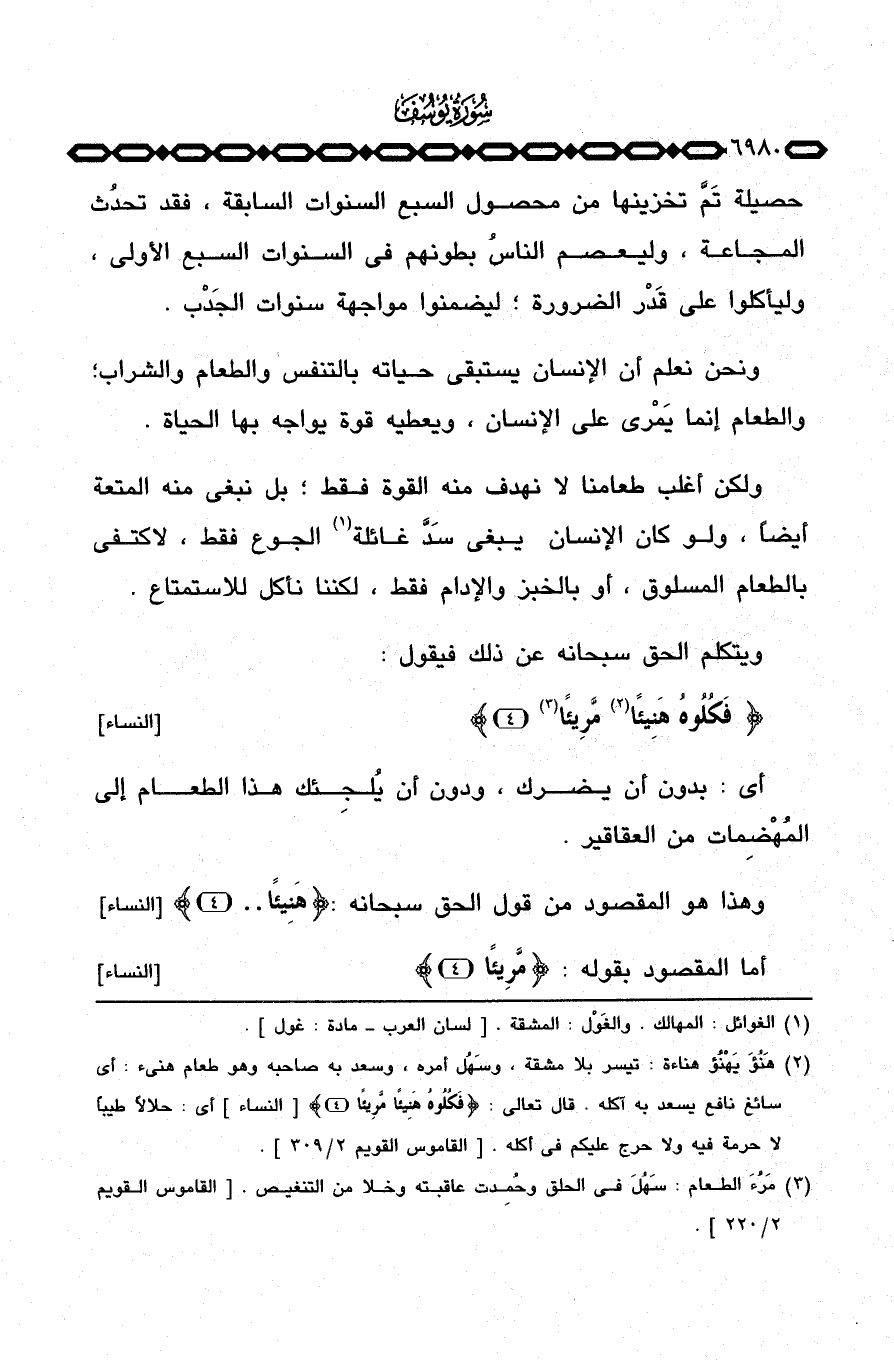 ونحن نعلم أن الإنسان يستبقي حياته بالتنفس والطعام والشراب؛ والطعام إنما يَمْري على الإنسان، ويعطيه قوة يواجه بها الحياة.