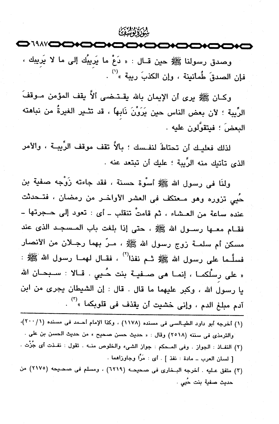 ولنا في رسول الله صَلَّى اللَّهُ عَلَيْهِ وَسَلَّم َ أسوة حسنة، «فقد جاءته زَوْجه صفية بن حُيي تزوره وهو معتكف في العشر الأواخر من رمضان، فتحدثت عنده ساعة من العشاء، ثم قامتْ تنقلب أي: تعود إلى حجرتها فقام معها رسول الله صَلَّى اللَّهُ عَلَيْهِ وَسَلَّم َ، حتى إذا بلغت باب المسجد الذي عند مسكن أم سلمة زوج رسول الله صلى الله صَلَّى اللَّهُ عَلَيْهِ وَسَلَّم َ، مرّ بهما رجلان من الأنصار فسلَّما على رسول الله صَلَّى اللَّهُ عَلَيْهِ وَسَلَّم َ ثم نفذا، فقال لهما رسول الله صَلَّى اللَّهُ عَلَيْهِ وَسَلَّم َ:» على رِسْلكما، إنما هي صفية بنت حُيي. قالا: سبحان الله يا رسول الله، وكبر عليهما ما قال. قال: إن الشيطان يجري من ابن آدم مبلغ الدم، وإني خشيت أن يقذف في قلوبكما «.