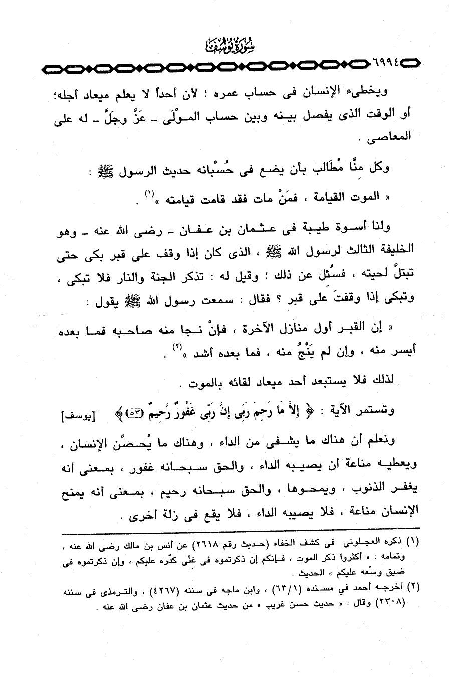 وكل مِنَّا مُطَالب بأن يضع في حُسْبانه حديث الرسول صَلَّى اللَّهُ عَلَيْهِ وَسَلَّم َ: «الموت القيامة، فمَنْ مات فقد قامت قيامته» .
